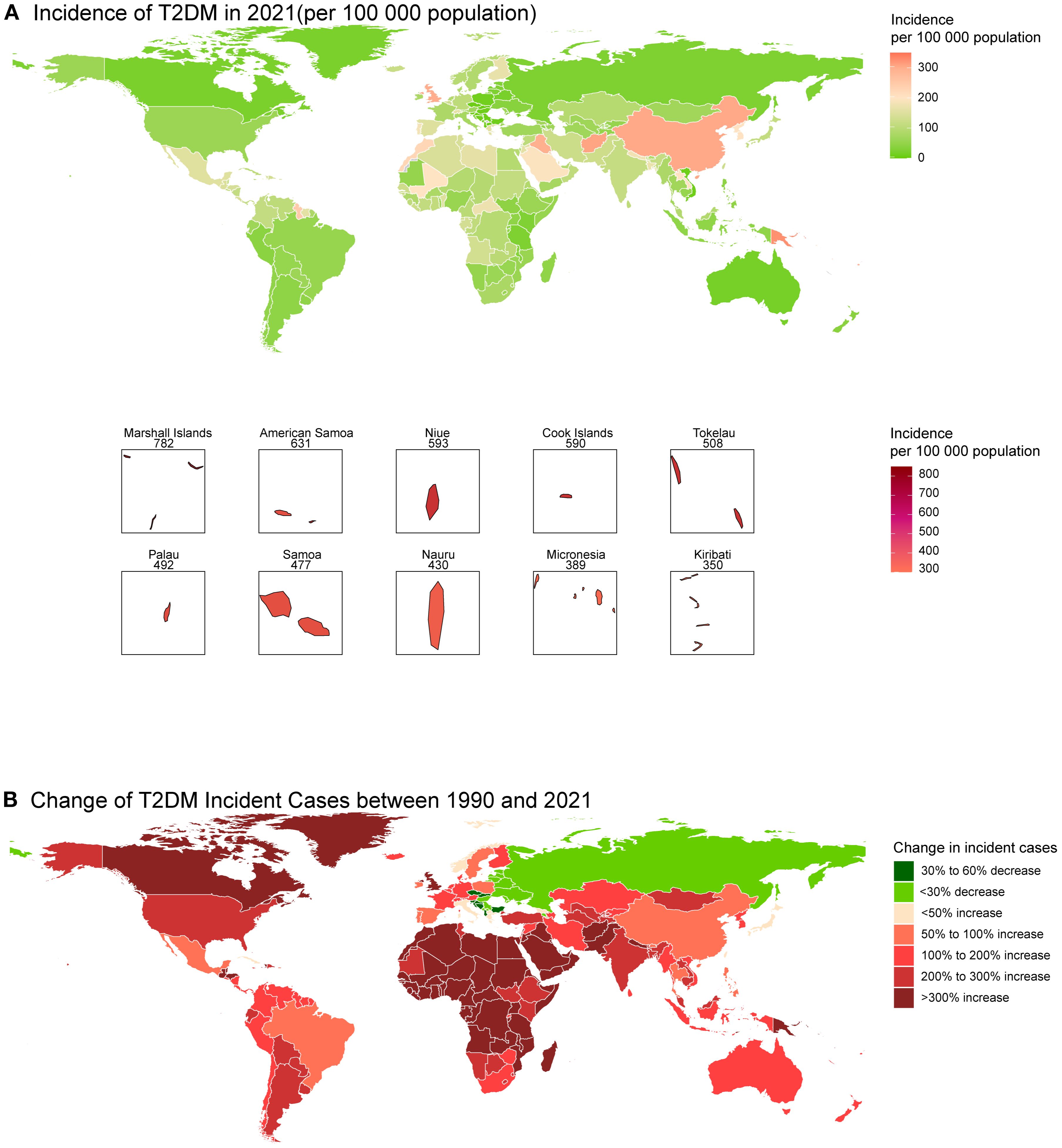 Figure 2. Global map of incidence of T2DM in 2021 (A) and the change in incident cases of T2DM among youth between 1990 and 2021 (B).