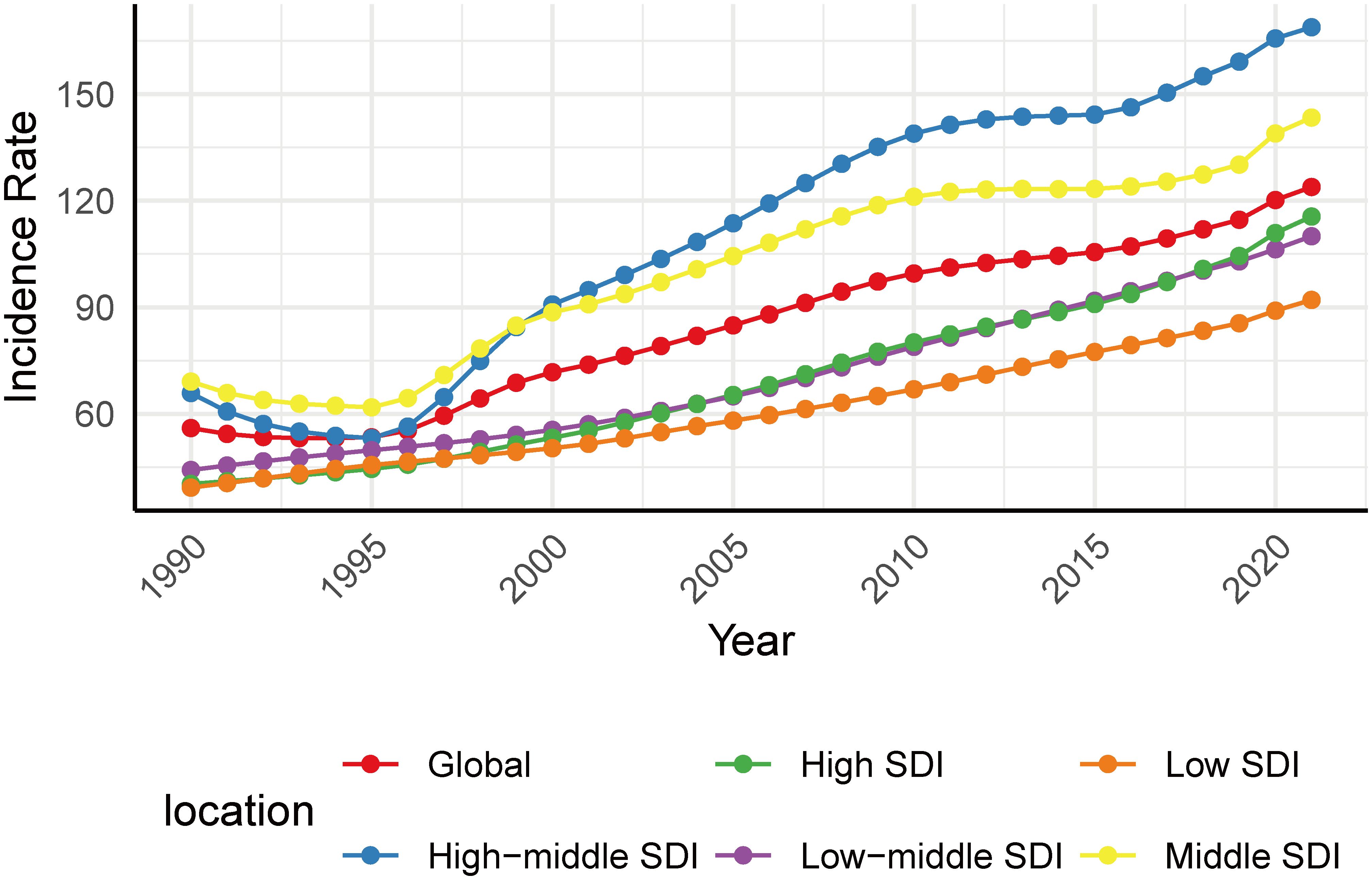 By SDI quintile, the incidence varied among different SDI areas. Low and high SDI areas presented lower incidence, while those middle and high-middle SDI areas presented higher incidence both in 1990 and 2021 (Figure 3). Despite still having a relatively low incidence rate (incidence 115.5, 95% CI: 92.6 - 141.8) in 2021, the largest increase occurred in high SDI areas (AAPC 3.48, 95% CI: 3.43 - 3.52) from 1990 to 2021. This pattern was also reflected in the increase of prevalence (AAPC 4.33, 95% CI: 4.17 - 4.49) and DALYs (AAPC 3.27, 95% CI: 3.16 - 3.37; Table 1) in high SDI areas.