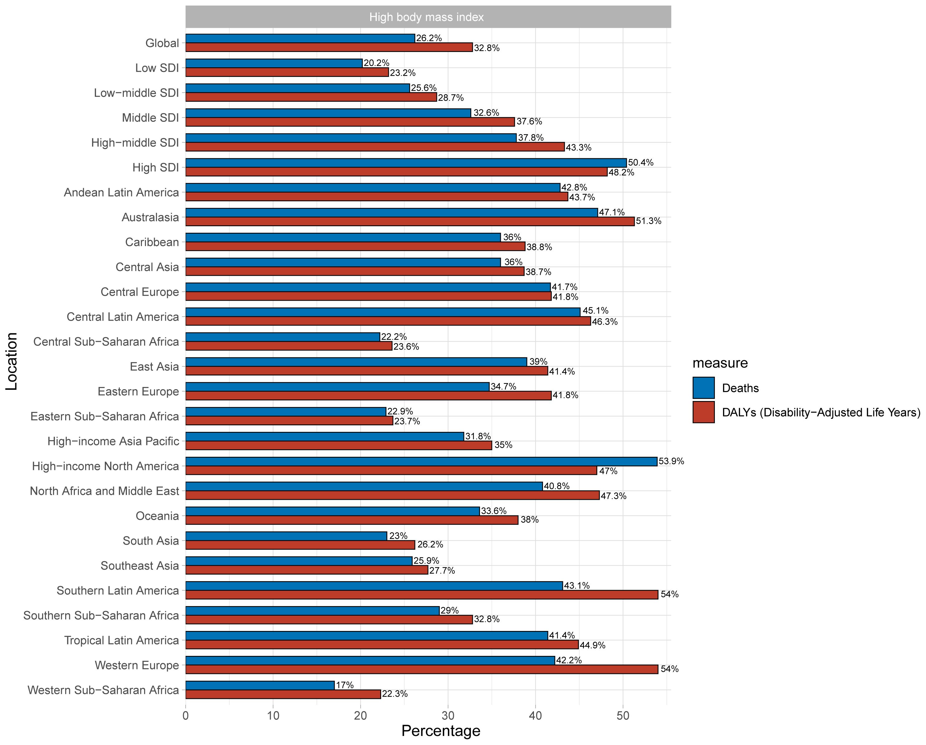 High BMI was analyzed as one of the most influential risk factors in this part. High BMI accounts for 32.8% (95% UI: 17.4% - 43.7%) of the global burden of T2DM among youth (Figure 4). As for SDI, the burden of T2DM increased with development in the areas, and high SDI areas bear the greatest burden, with high BMI accounting for 58.2% of T2DM burden (95% UI: 28.1% - 60.8%). South Latin America and Western Europe had the largest DALYs attributable to high BMI (Figure 4).