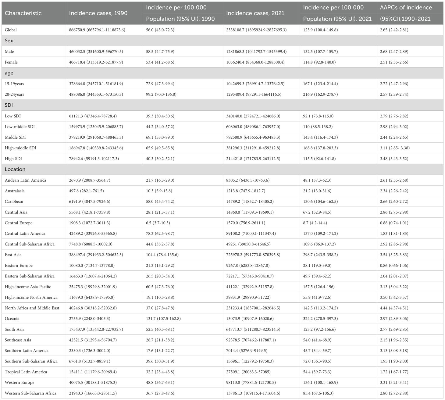 Results: The global incidence, prevalence, and DALYs of T2DM in youth increased to varying degrees from 1990 to 2021. With an AAPC of 2.62 (95% CI: 2.42 - 2.81), the global incidence of T2DM increased from 56.0 per 100–000 population in 1990 to 123.9 per 100–000 population in 2021. The incidence of increase in males (AAPC 2.68, 95% CI: 2.47 - 2.89) was higher than in females (AAPC 2.51, 95% CI: 2.35 - 2.66). The incidence increased with increasing age, but the largest increase was found in youth aged 15–19 years (AAPC 2.72, 95% CI: 2.47 - 2.96). High SDI areas saw the greatest increase in incident rates (AAPC 3.48, 95% UI: 3.43 - 3.52) compared with other areas.