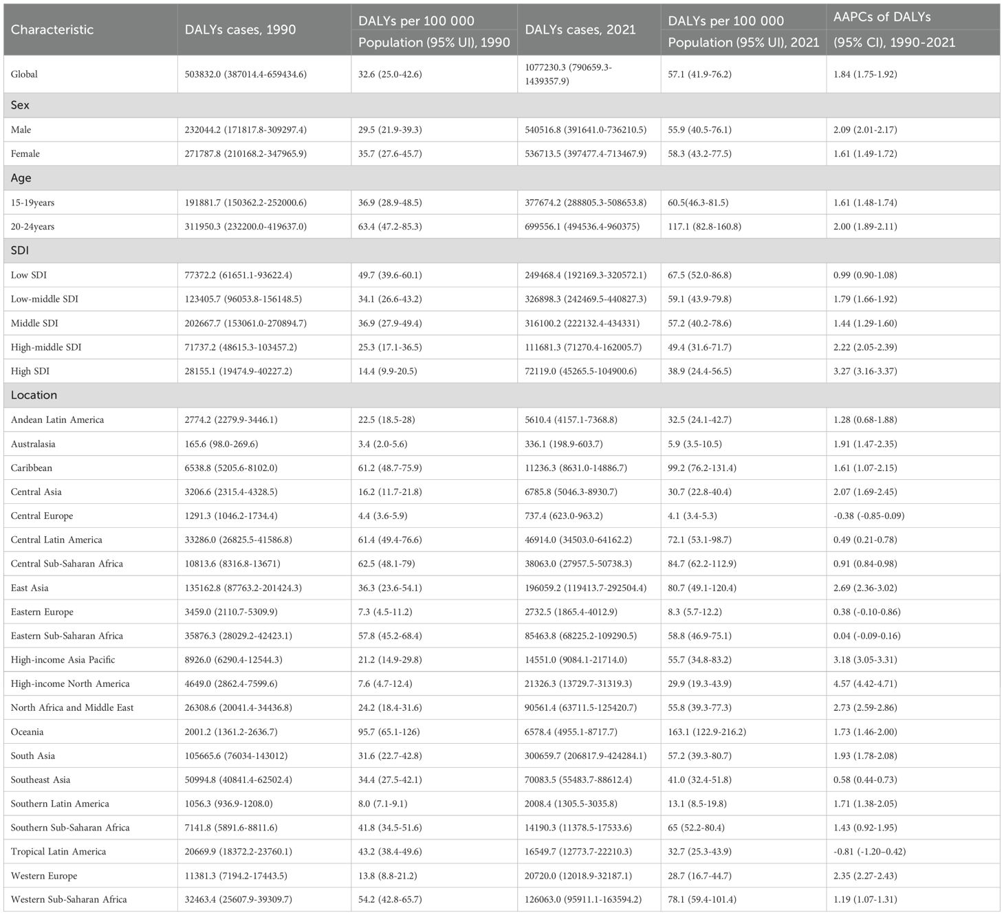Upon gender comparison, the observed increase can be found both in incidence and prevalence across all genders. The incidence and prevalence of increases in males (with incidence AAPC of 2.68, 95% CI: 2.47 - 2.89; with prevalence AAPC of 2.62, 95% CI: 2.45 - 2.78) were higher than females (with incidence AAPC of 2.51, 95% CI: 2.35 - 2.66; with prevalence AAPC of 2.44, 95% CI: 2.26 - 2.62; Table 1). The DALYs of males (29.5, 95% CI: 21.9 - 39.3) were lower than those of females (35.7, 95% CI: 27.6 - 45.7) in 1990, but the increase was still higher over these 30 years. In 2021, the DALYs of males (DALYs 55.9, 95% UI: 40.5 - 76.1) were higher than those of females (DALYs 58.3, 95% UI: 43.2 - 77.5; Table 2).