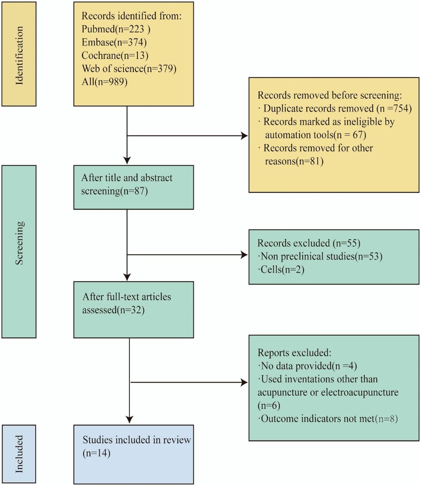 Our research endeavor commenced with the implementation of a retrieval strategy. Two independent researchers (LLS, GZY) retrieved a total of 898 articles by searching in four databases (223 from PubMed, 374 from Embase, 379 from Web of Science, and 11 from Cochrane). After reading the titles, abstracts, and authors, and eliminating duplicates and irrelevant literature, 87 articles remained. By evaluating the titles and abstracts, we excluded 53 non-preclinical studies, and 2 studies specifically related to cells. Subsequently, a comprehensive examination of the full text was conducted for 32 articles. Among these, 4 articles met the inclusion criteria but did not provide data and were thus excluded. Additionally, 6 articles used interventions other than acupuncture and electroacupuncture, and 8 articles did not meet outcome indicators, leading to their exclusion as well. Ultimately, 14 studies were selected for a comprehensive analysis (15, 24–36) The process and results of literature selection are shown in Figure 1.