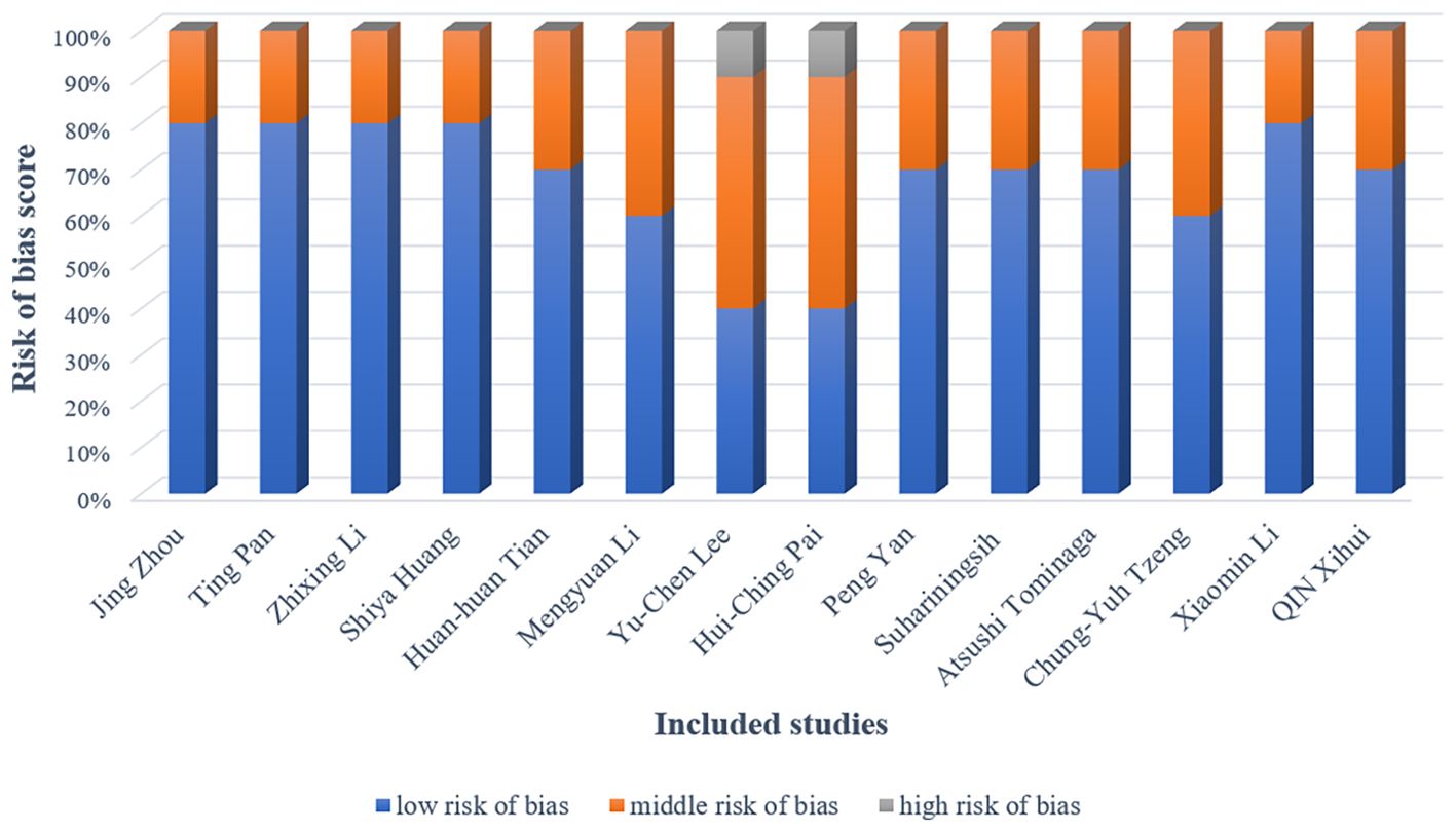 The basic characteristics of the 14 selected studies are summarized in Table 1, A total of 274 animals were included in this study. Most of these animals were Sprague–Dawley rats, accounting for 57% of the sample, followed by Wistar rats at 29%, and Mus musculus at 14% (Figure 2A). Concerning the T2DM animal models used, all included studies used induced models of diabetes, including intraperitoneal streptozotocin (STZ) injection, high-fat diet feeding, or letrozole combined with high-fat diet. no spontaneous diabetes models (genetic models such as db/db mice) were included, with the intraperitoneal injection of STZ model being the most prevalent, featured in 43% of the studies, models fed with High-Fat Diet (HFD) made up 22%, models fed with NORM represent 21% and LET accounts for 14%. Each percentage reflects the proportion of studies using these specific methods (Figure 2B). Furthermore, there are significant differences in the selection of acupuncture points. ST36 acupuncture point was the most selected (16%), followed by SP6 (11%). CV4 and ST25 each account for 8%. Several other acupoints, including BL23, CV3, ST40, and EX-B3, each account for 5%. A variety of other acupoints, such as BL20, GV24, and LI11, each account for 3% (Figure 2C). Notably, In the context of timing and duration of treatment,93% of the treatments were administered after modeling, while only 7% of the treatments were administered at the start of modeling (Figure 2D). The duration of acupuncture treatment varied, ranging from 1 to 28 days, 24-days treatment durations were the most common, representing 29% of the studies (Figure 2E). The study showed that the number of animals in each group in the included literature varied, with groups of 8 making up the largest portion (36%), groups of 10,22%, and groups of 12,21%. Groups 9, 5 and 7 each accounted for 7% of the total (Figure 2F), It shows that 50% prefer a 20-minute treatment time, 29% choose a 30-minute treatment time, and 7% each prefer a 10-minute treatment time, a 60-minute treatment time, and a 6-minute treatment time (Figure 2G). For example, both the 28 times and 15 times acupuncture sessions account for 15%, while the 12 times, 21 times, and 20 times sessions represent 7%, 14%, and 14% (Figure 2H).