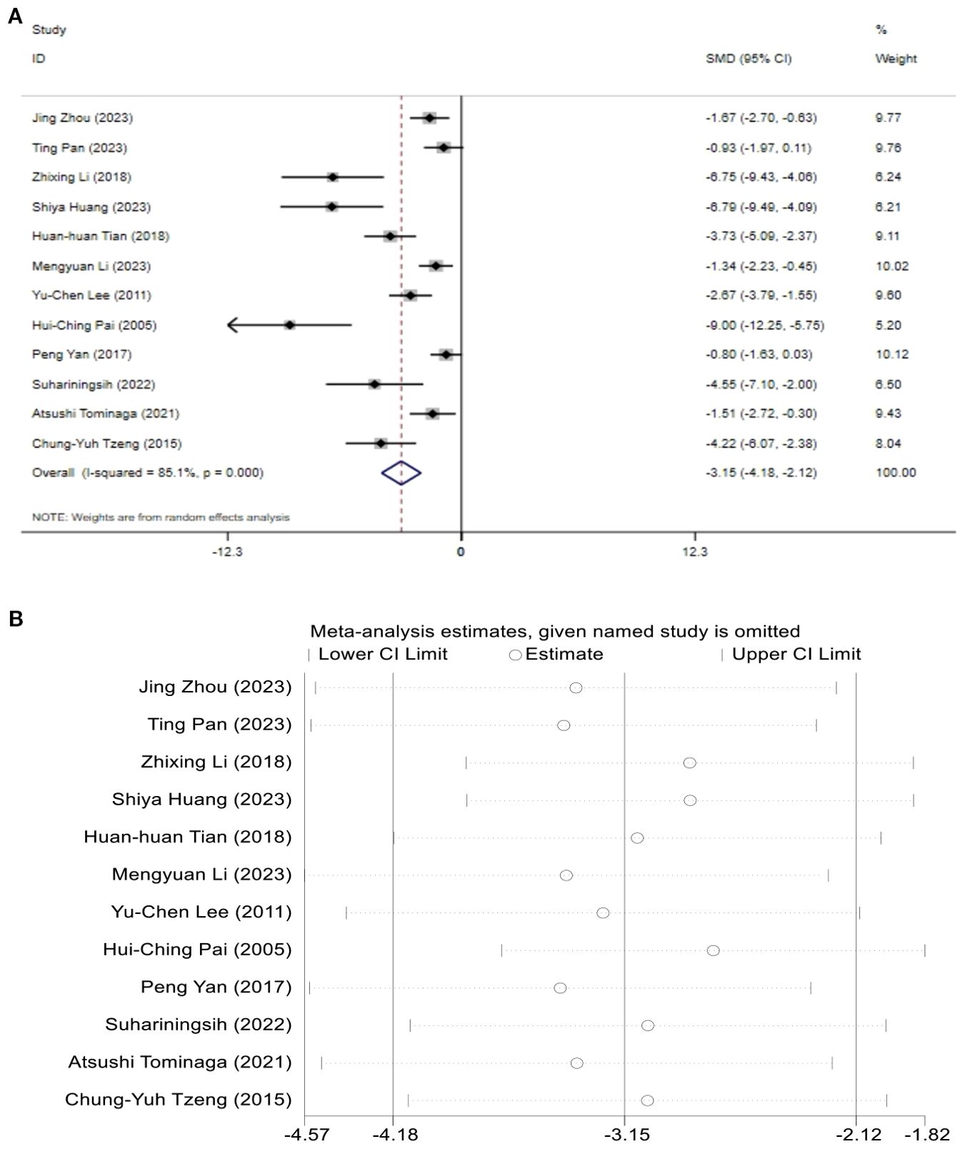 A total of 12 studies assessed the effect of BG. The results indicated that the levels of BG in the T2DM model group increased, while after acupuncture treatment, BG levels showed a significant reduction compared to the T2DM model group. [SMD = -3.15, 95% CI (-4.18, -2.12), I2 = 85.1%] (P < 0.05) (Figure 4A). Sensitivity analysis showed that the combined effect estimates of all studies were within the confidence interval of the overall effect, indicating the reliability of the study results (Figure 4B).