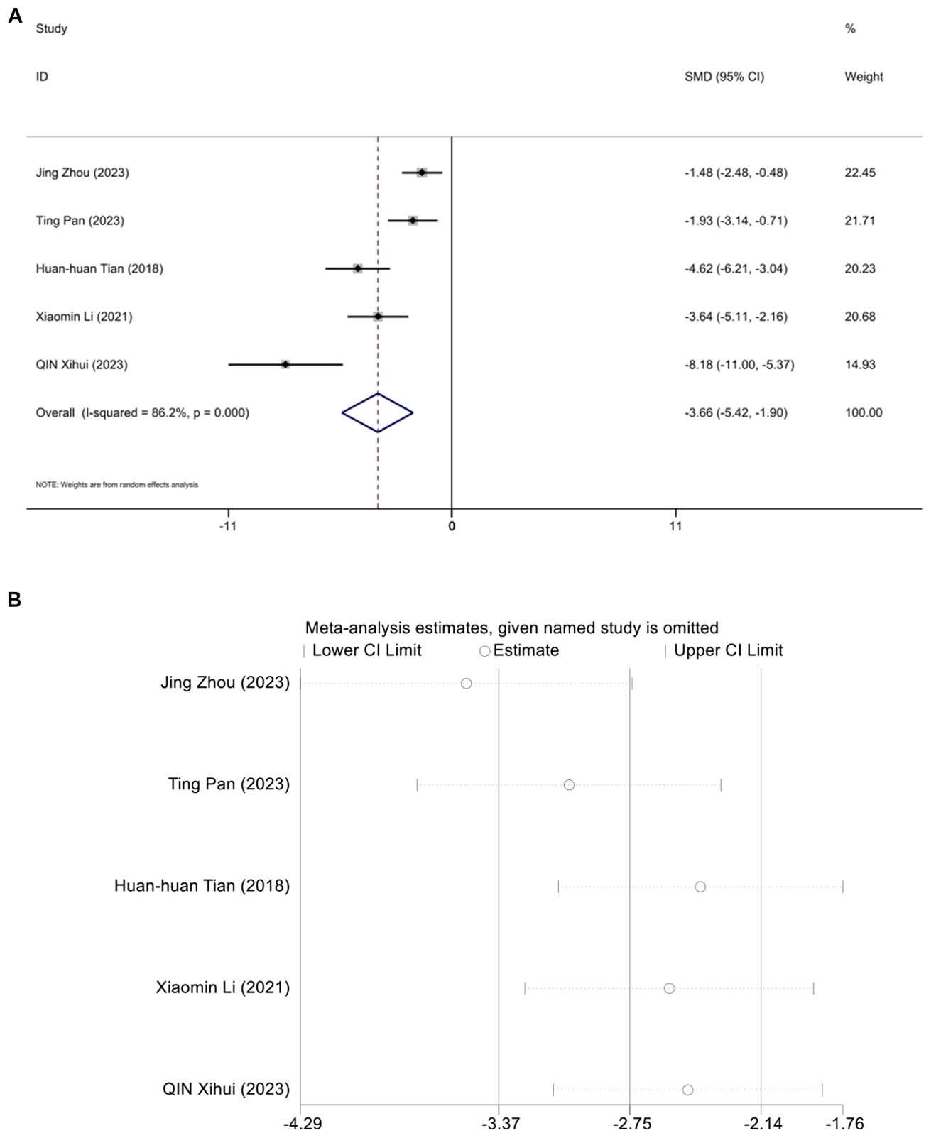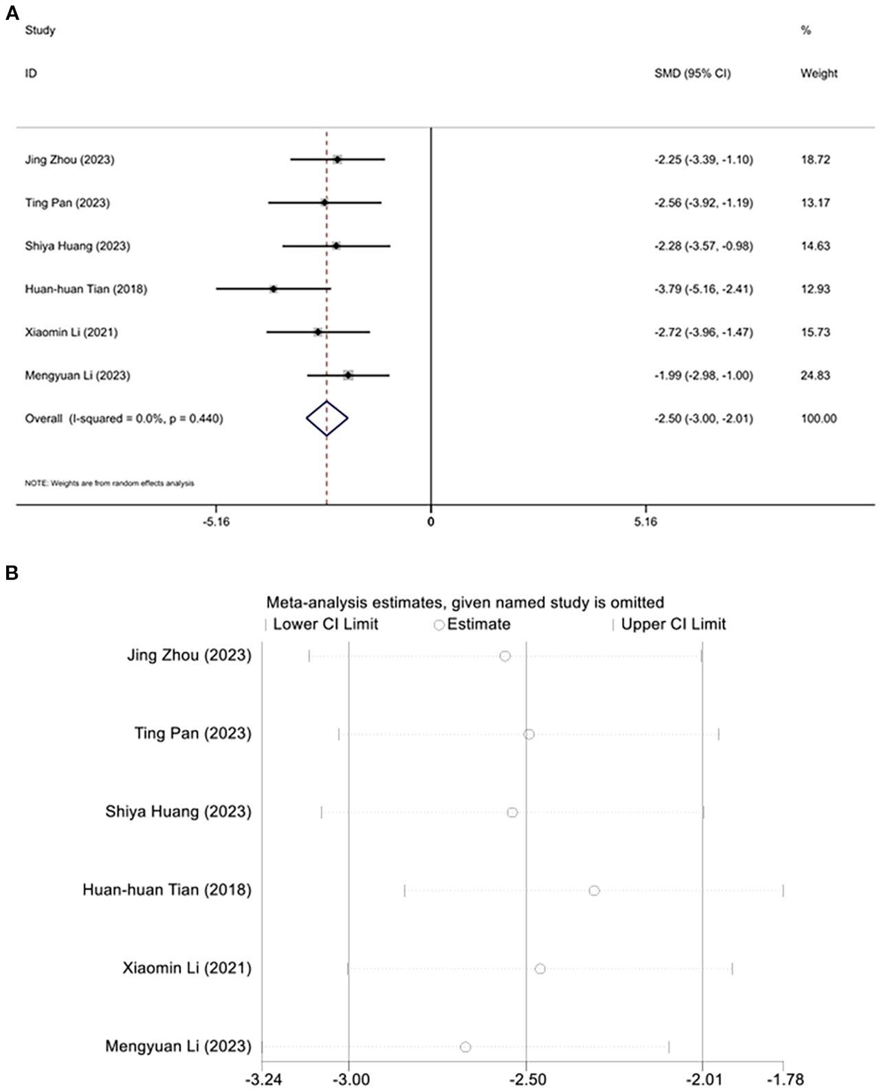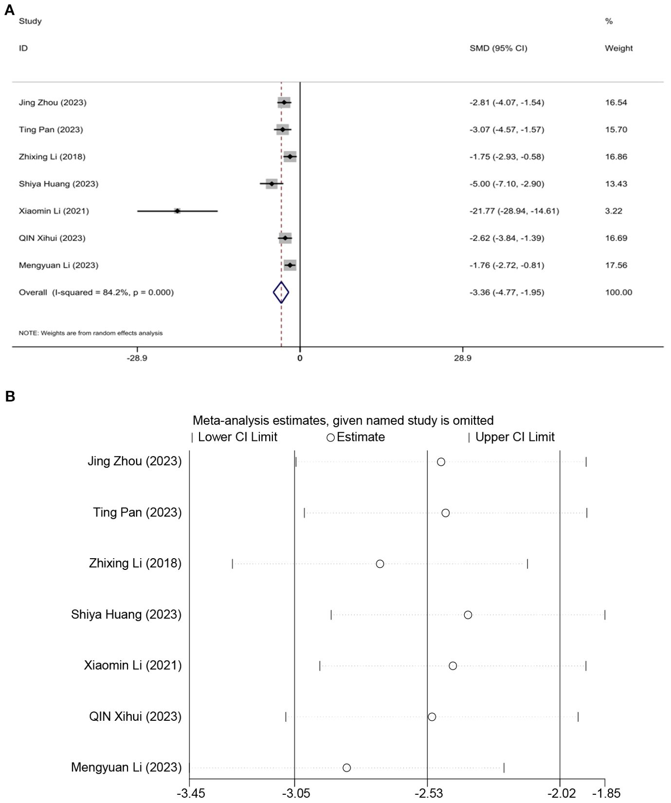 Seven studies assessed the effect of BW, demonstrating that acupuncture can reduce weight. A random effects model was used, and the meta-analysis showed that acupuncture significantly reduces BW in an animal model of T2DM. [SMD = -3.36, 95%CI (-4.77, -1.95), I2 = 84.2%] (P < 0.05) (Figure 5A). Sensitivity analysis indicated that the combined effect estimates of all studies fell within the confidence interval of the overall effect, demonstrating the reliability of the study results (Figure 5B).