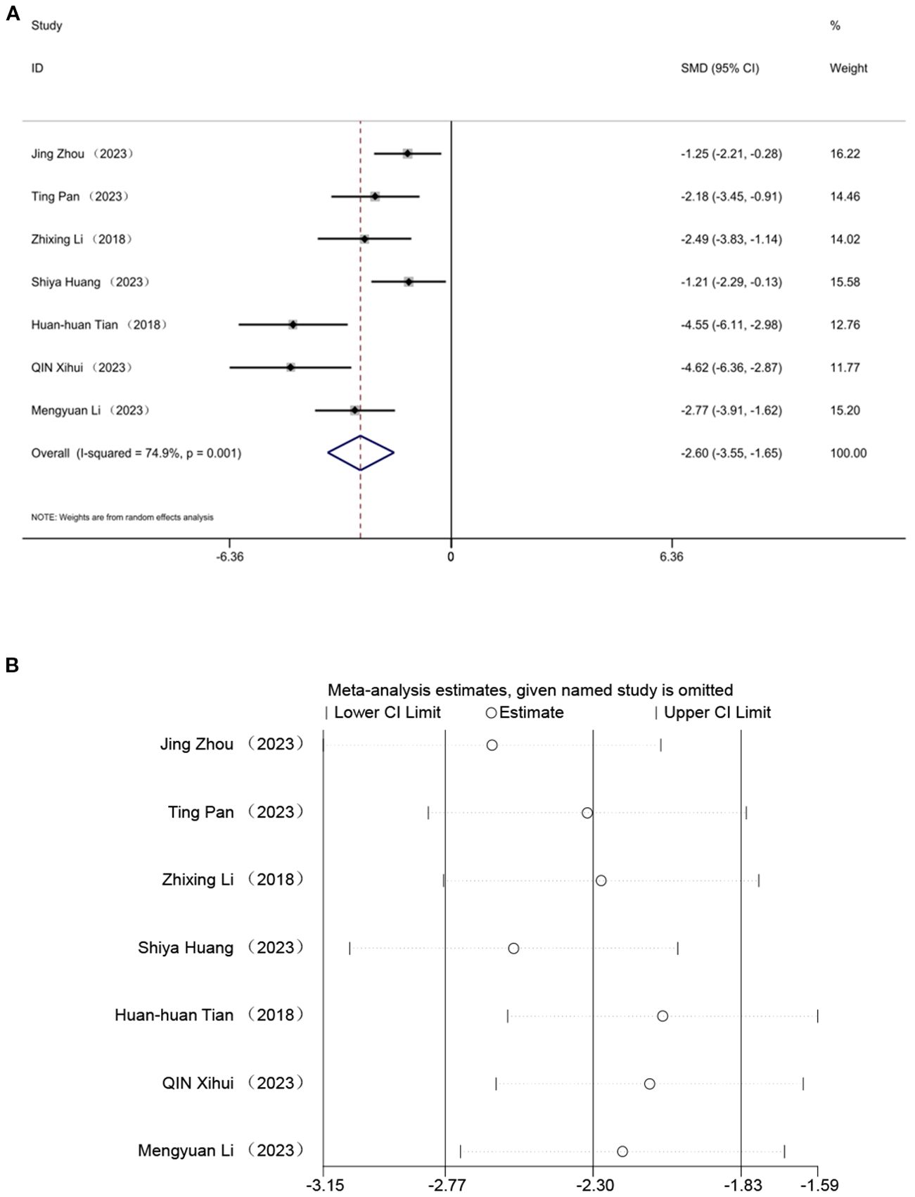 Seven studies evaluated the effect of TC, indicating that acupuncture can lower TC levels. A random effects model was employed, and the meta-analysis revealed a significant reduction in TC with acupuncture in an animal model of T2DM. [SMD = -2.60, 95% CI (-3.55,-1.65), I² = 74.9%](P < 0.05) (Figure 7A). Sensitivity analysis further validated the strength of the LDL-C findings (Figure 7B).
