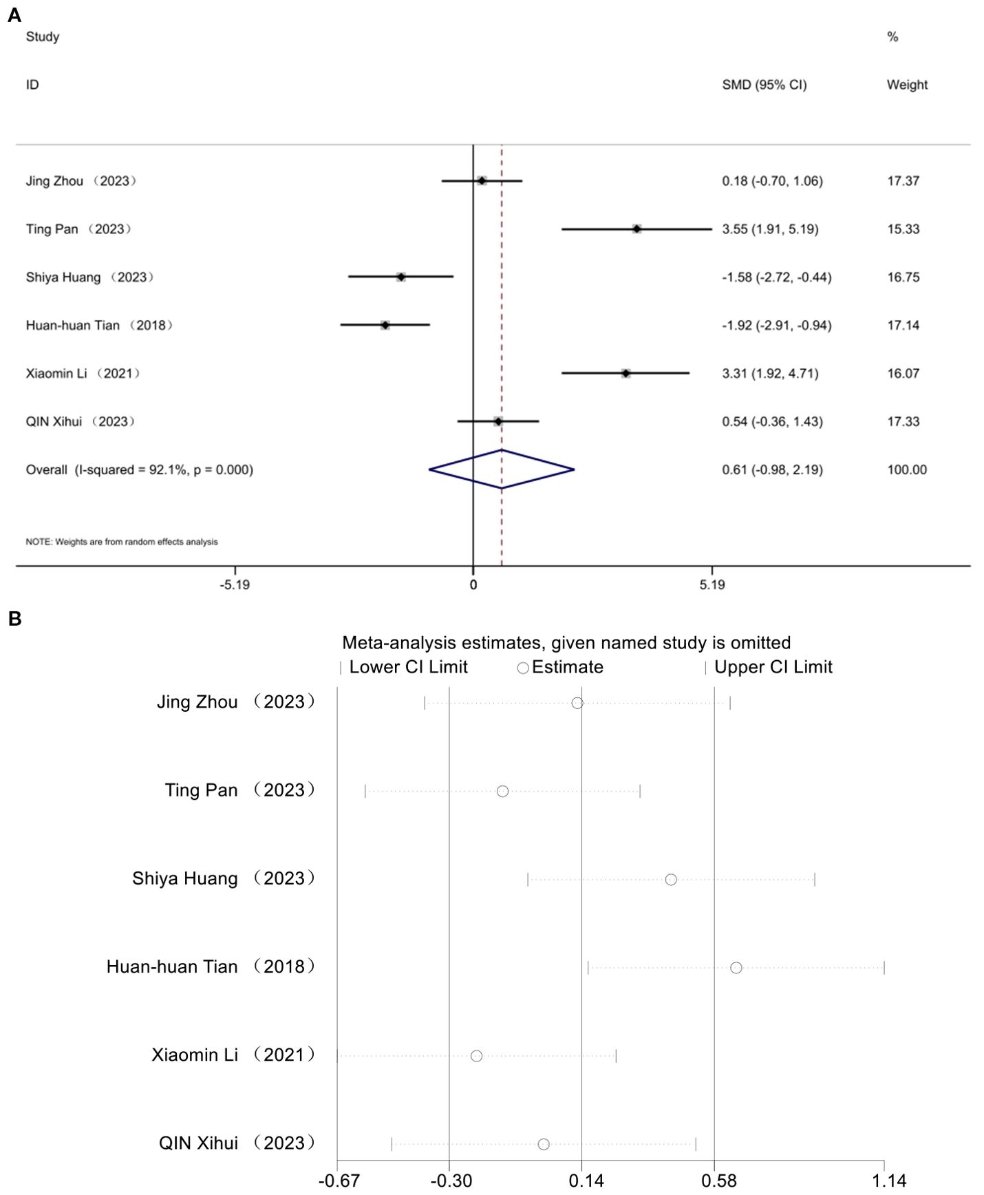 The impact of HDL was documented in six studies. Analysis utilizing a random effects model revealed a notable decline in HDL levels within the diabetic mouse model [SMD = 0.61, 95% CI (-0.98, 2.19), I² = 92.1%] (P> 0.05) (Figure 8A). No statistically significant difference was observed in high-density lipoprotein cholesterol levels following acupuncture treatment in this T2DM animal model. Sensitivity analysis affirmed the robustness of the HDL findings (Figure 8B).
