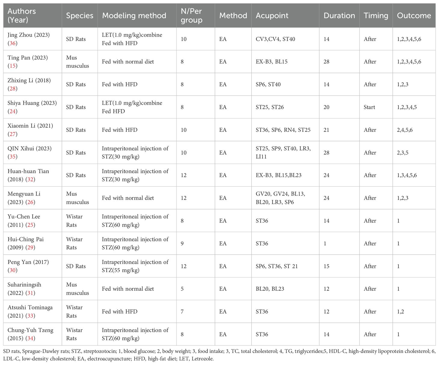In China, acupuncture is a key component of Traditional Chinese Medicine (TCM) and has been used as an alternative therapy to treat diseases for a long time. Since 1979, it is recognized as a complementary therapy by the World Health Organization (WHO) (17). Several systematic reviews and meta-analyses have evaluated the effects of acupuncture in patients with diabetes mellitus, generally reporting small sample sizes, methodological limitations, and insufficient evidence to make strong clinical recommendations. Our study focuses on animal models to provide preclinical evidence, which complements these human studies and can guide the design of future large-scale, high-quality clinical trials. Virtually, acupuncture has been used to treat diabetes mellitus because of its benefits in various aspects such as effectiveness, economy, convenience, and low side effect (18). Some modern medical research has confirmed that acupuncture can decrease blood sugar and improve the symptoms of diabetes because of its effects on enhancing the insulin sensitive index, ameliorating insulin resistance, and regulating blood lipids (11). In human clinical trials investigating acupuncture for diabetes, ethical constraints—such as the difficulty in designing ethical and effective sham control groups, challenges in achieving adequate blinding (which raises issues with informed consent), and the tension between standardized protocols and individualized treatment—significantly limit the methodological rigor and scope of studies. Consequently, these constraints impede the acquisition of comprehensive and unambiguous evidence regarding acupuncture’s specific efficacy. Animal studies not only allow for the minimization of external factors to attain more precise results but also facilitate the exploration of the experiment’s underlying mechanisms (19). A systematic review of animal studies can bring more precise accurate decisions in medical care (20). Therefore, we aim to a systematic review and meta-analysis of the effectiveness of acupuncture for treating diabetes in animal models by regulating lipid metabolism. whether acupuncture therapy the effects by regulating lipid metabolism for T2DM on levels of blood glucose (BG), high density lipoprotein (HDL), low-density lipoprotein (LDL), triacylglycerol (TG), Cholesterol (TC) in T2DM animals. overall, acupuncture may provide innovative therapeutic strategies to improve the clinical management of T2DM.