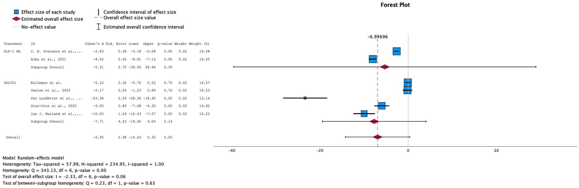 Both GLP-1 RA and SGLT-2i, individually and in combination, resulted in a decrease in HbA1c levels, with a standardized mean difference of -6.95 (95% CI: [-14.24, 2.98], p-value= 0.06) for the overall effect size (see Figure 4). 9 out of 14 of our studies included data on HbA1c as an outcome. However, one study (22) was excluded from the analysis because the calculated difference of the standard deviation (SD) between baseline levels and follow-up values was equal to 0, and another (12) due to the values for the interventional group being reported as changes from baseline as compared to the control group rather than as two sets of data. The 7 remaining studies showed a high level of heterogeneity (I-squared: 100%), prompting the use of a random-effects model. Overall, the studies demonstrated a general trend of decreasing levels, with a statistically significant overall p-value of 0.06. However, the subgroup analyses for each drug individually showed wide confidence intervals.