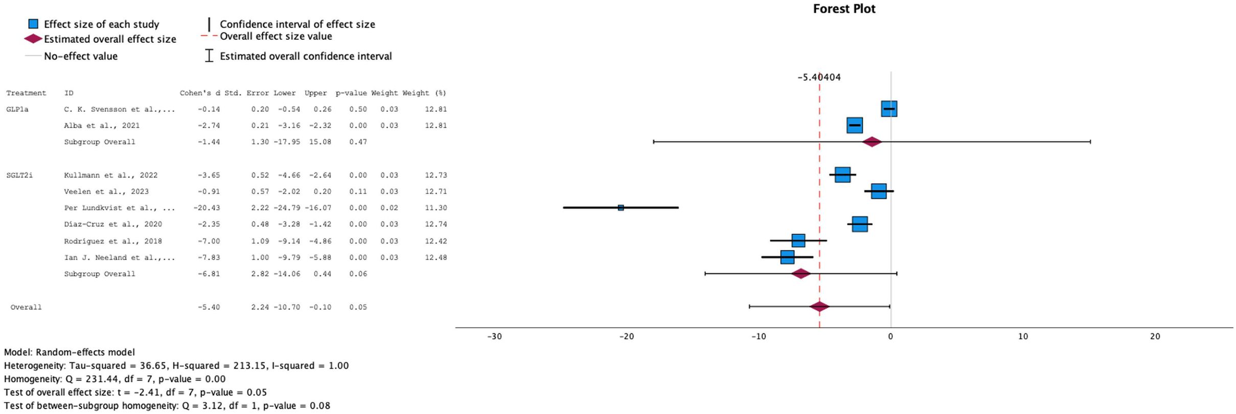 Finally, the last study done by Neeland et al. on empagliflozin (23) compared to a placebo group showed an HbA1C drop compared to the control group (MD = -0.1%, SD = 0.02%, p-value<0.01). Additionally, a significant reduction in body weight was observed (MD = -5.5 kg, SD = 2.66, p-value < 0.01). Finally, the study also demonstrated a statistically significant decrease in fasting glucose levels in the treatment group compared to the placebo group (MD = -1.6, SD = 0.4, p-value < 0.01).