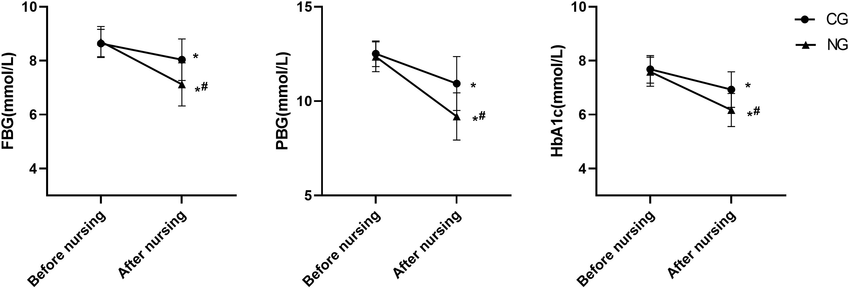 Figure 1. Comparison of blood glucose levels. *P<0.05 compared with before nursing, #P<0.05 compared with CG.