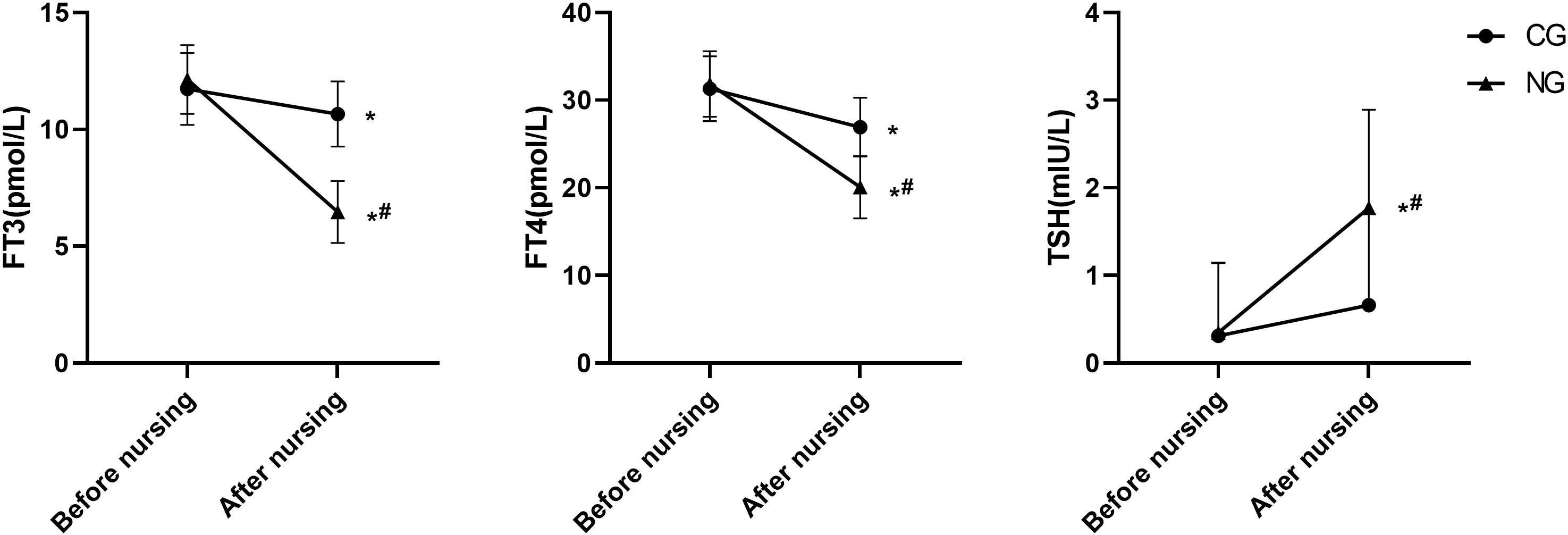 Figure 2. Comparison of thyroid function. *P<0.05 compared with before nursing, #P<0.05 compared with CG.