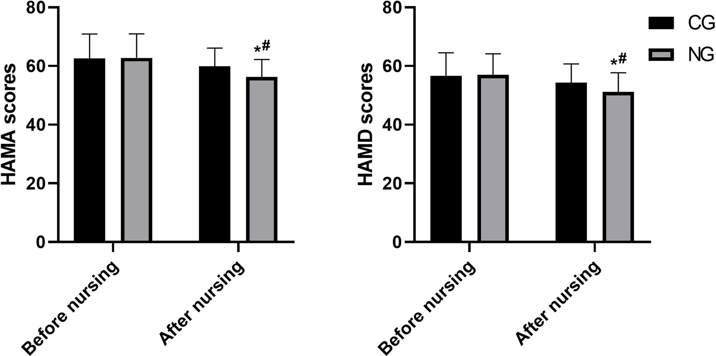 Figure 4. Comparison of HAMA and HAMD scores. *P<0.05 compared with before nursing, #P<0.05 compared with CG.