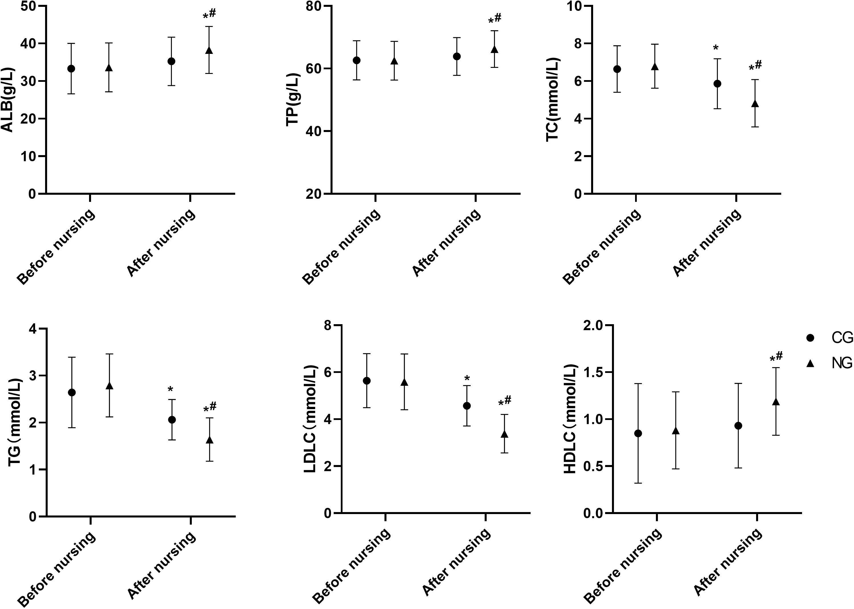 Nutritional and lipid profiles were significantly improved by the comprehensive nursing intervention. After the intervention, albumin (ALB) levels increased by 4.62 g/L in the NG (to 38.26 ± 6.26 g/L), compared to an increase of 1.95 g/L in the CG (to 35.26 ± 6.43 g/L). Total protein (TP) increased by 3.71 g/L in the NG (to 66.22 ± 5.87 g/L) versus 1.22 g/L in the CG (to 63.86 ± 6.03 g/L). Beneficial changes in lipid metabolism were also evident: total cholesterol (TC) decreased by 1.97 mmol/L in the NG (to 4.82 ± 1.26 mmol/L) versus 0.78 mmol/L in the CG (to 5.86 ± 1.33 mmol/L); triglycerides (TG) decreased by 1.15 mmol/L in the NG (to 1.64 ± 0.46 mmol/L) versus 0.58 mmol/L in the CG (to 2.06 ± 0.43 mmol/L); low-density lipoprotein cholesterol (LDLC) decreased by 2.21 mmol/L in the NG (to 3.38 ± 0.82 mmol/L) versus 1.07 mmol/L in the CG (to 4.57 ± 0.86 mmol/L). High-density lipoprotein cholesterol (HDLC) increased by 0.31 mmol/L in the NG (to 1.19 ± 0.36 mmol/L), a greater improvement than the 0.08 mmol/L increase in the CG (to 0.93 ± 0.45 mmol/L) (P < 0.05 for all between-group comparisons post-intervention, Figure 3).