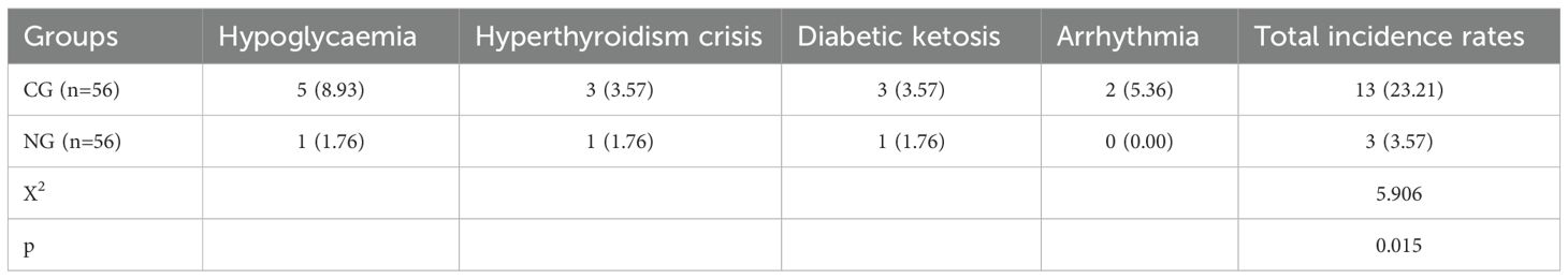 4. Complications. Complications after care were observed in both groups, including hypoglycaemia, hyperthyroid crisis, diabetic ketosis and cardiac arrhythmia.