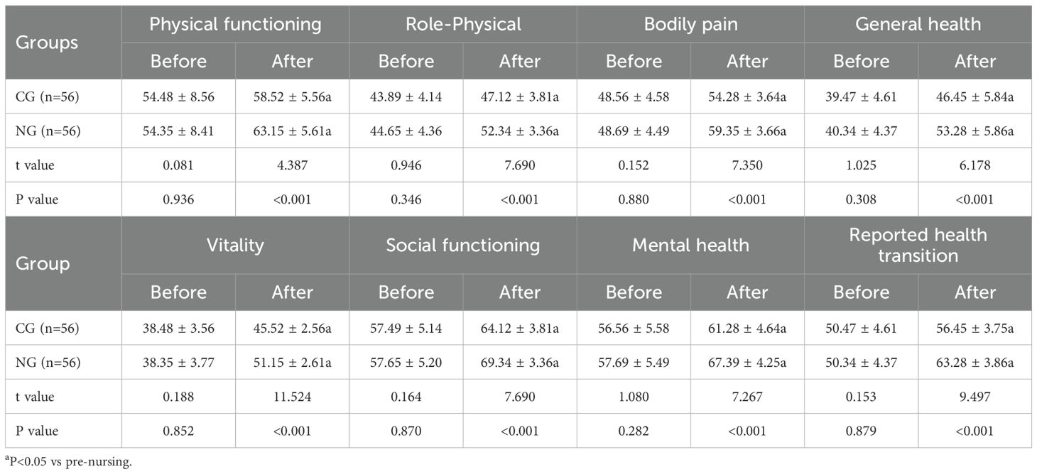 The SF-36 outcomes demonstrated superior improvement in quality of life across all eight domains for the NG compared to the CG after the intervention. The post-intervention scores and the magnitude of improvement (change from baseline) were consistently and significantly greater in the NG. Key improvements included: In Physical Functioning, the NG score increased by 8.80 points (from 54.35 to 63.15), substantially more than the 4.04-point increase in the CG (from 54.48 to 58.52). For Role-Physical, the NG improved by 7.69 points (from 44.65 to 52.34), compared to a 3.23-point improvement in the CG (from 43.89 to 47.12). Bodily Pain scores showed a 10.66-point increase in the NG (from 48.69 to 59.35), which was nearly double the 5.72-point increase observed in the CG (from 48.56 to 54.28). The General Health perception improved by 12.94 points in the NG (from 40.34 to 53.28), a gain more than twice that of the CG (6.98 points, from 39.47 to 46.45). Vitality increased by 12.80 points in the NG (from 38.35 to 51.15), dramatically outperforming the 7.04-point increase in the CG (from 38.48 to 45.52). Social Functioning improved by 11.69 points in the NG (from 57.65 to 69.34), compared to a 6.63-point improvement in the CG (from 57.49 to 64.12). For Mental Health, the NG score rose by 9.70 points (from 57.69 to 67.39), a significantly greater increase than the 4.72 points seen in the CG (from 56.56 to 61.28). The Reported Health Transition domain saw a 12.94-point improvement in the NG (from 50.34 to 63.28), again markedly larger than the 5.98-point improvement in the CG (from 50.47 to 56.45). The between-group differences in all post-intervention domain scores were statistically significant (all p < 0.001, Table 3).