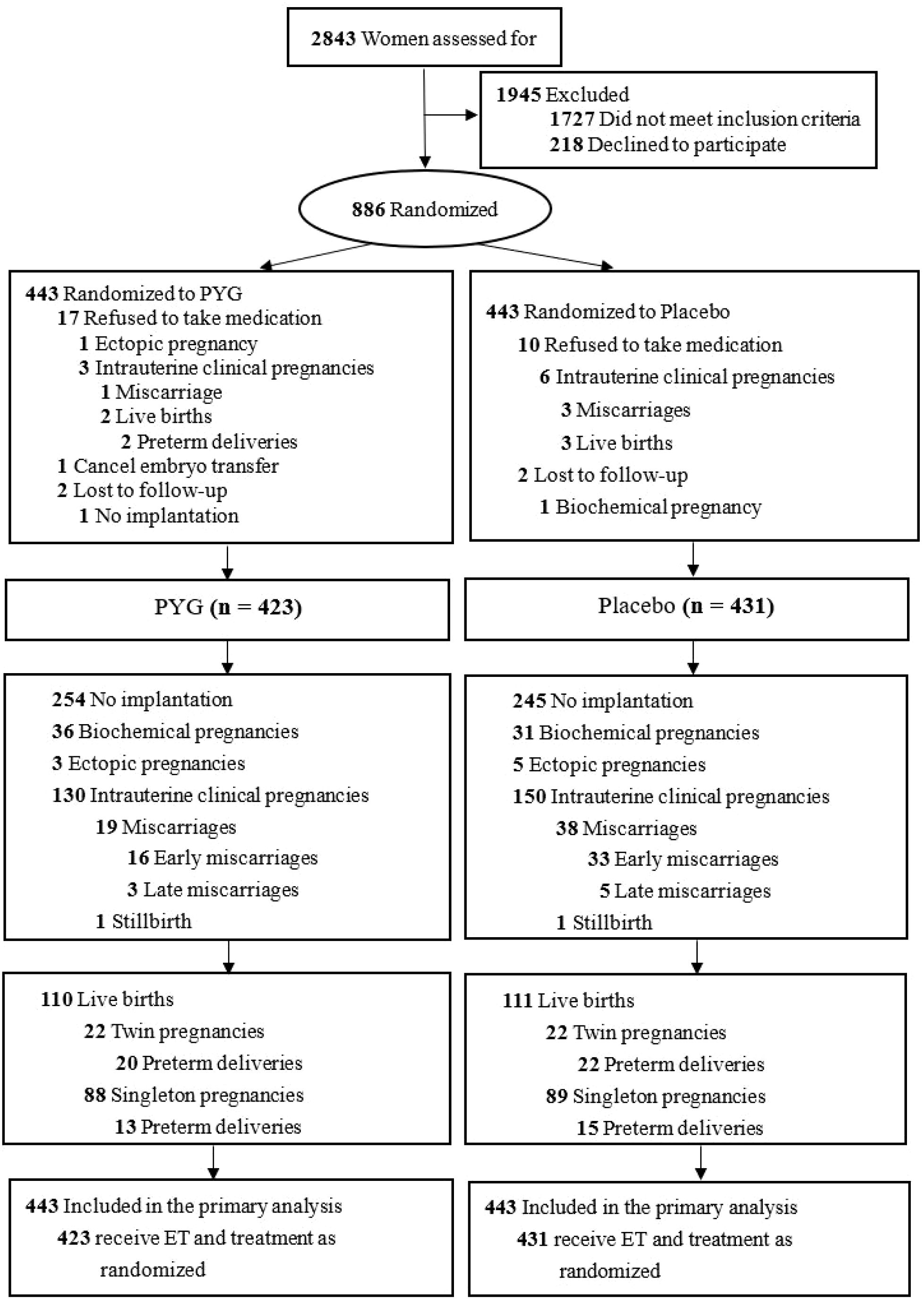 Results: Among the 886 randomized women (mean [SD] age, 32.8 [3.6] years), 854 women (96.4%) underwent ET and followed the treatment of random grouping. Early miscarriage occurred among 17 of 133 women (12.8%) receiving PYG compared with 35 of 156 women (22.4%) receiving placebo (relative risk[RR], 0.51 [95% CI, 0.27 to 0.95], P = 0.02). Clinical intrauterine pregnancy rates were 30.0% (133 of 443) in the intervention group and 35.2% (156 of 443) in the control group (relative risk[RR], 0.79 [95% CI, 0.60 to 1.05], P = 0.10). Live-birth rates were 25.3% (112 of 443) in the intervention group and 25.7% (114 of 443) in the control group (relative risk[RR], 0.98 [95% CI, 0.72 to 1.32], P = 0.88). Live birth rates in the clinical pregnant population were 84.2% (112/133) in the intervention group and 73.7% (115/156) in the control group (relative risk [RR], 1.14 [95% CI, 1.01 to 1.29], P = 0.03).