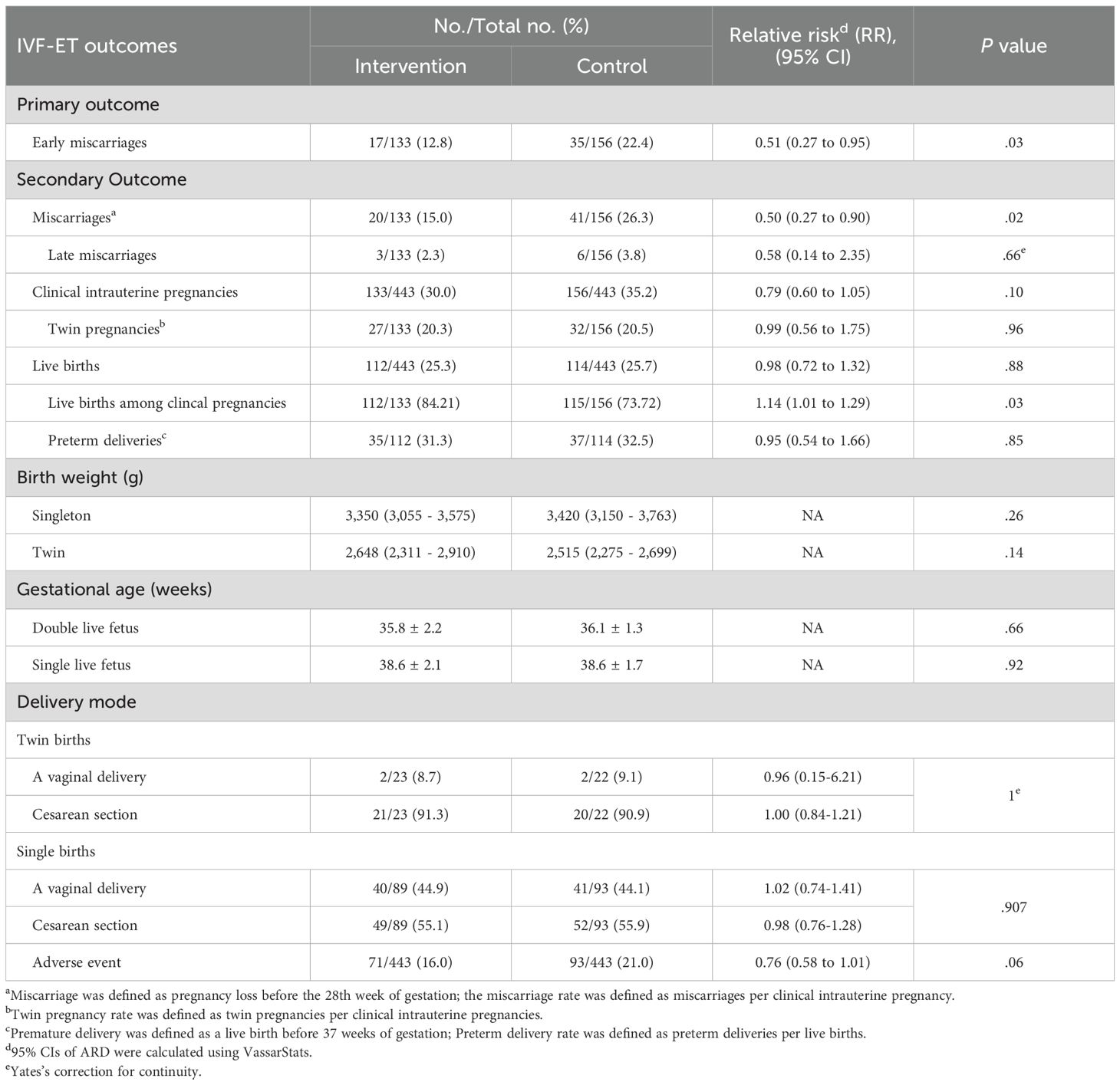As shown in Table 3, there was no significant differece in late miscarriage, clinical intrauterine pregnancy, and live births. The clinical intrauterine pregnancies rate is 30% (133/443) in the intervention group vs 35.2% (156/443) in the control group (rate ratio[RR], 0.79[95%CI,0.60 to 1.05]; P=0.10). The late miscarriage rate is 2.3% (3/133) in the intervention group vs 3.8% (6/156) in the control group (rate ratio[RR], 0.58[95%CI,0.14 to 2.35]; P=0.51). The total live births rate is 25.3% (112/433) in the intervention group vs 25.7% (114/443) in the control group (rate ratio[RR], 0.98[95%CI,0.72 to 1.32]; P=0.88). Live birth rates in the clinical pregnant population were 84.2% (112/133) in the intervention group and 73.7% (115/156) in the control group (relative risk[RR], 1.14 [95% CI, 1.01 to 1.29], P = 0.03). As shown in Table 3 and Supplementary Table S7, a total of 164 women suffered from adverse events, with no significant difference between groups (16.0% vs 21.0%; rate ratio[RR], 0.76 [95% CI, 0.58 to 1.01]).