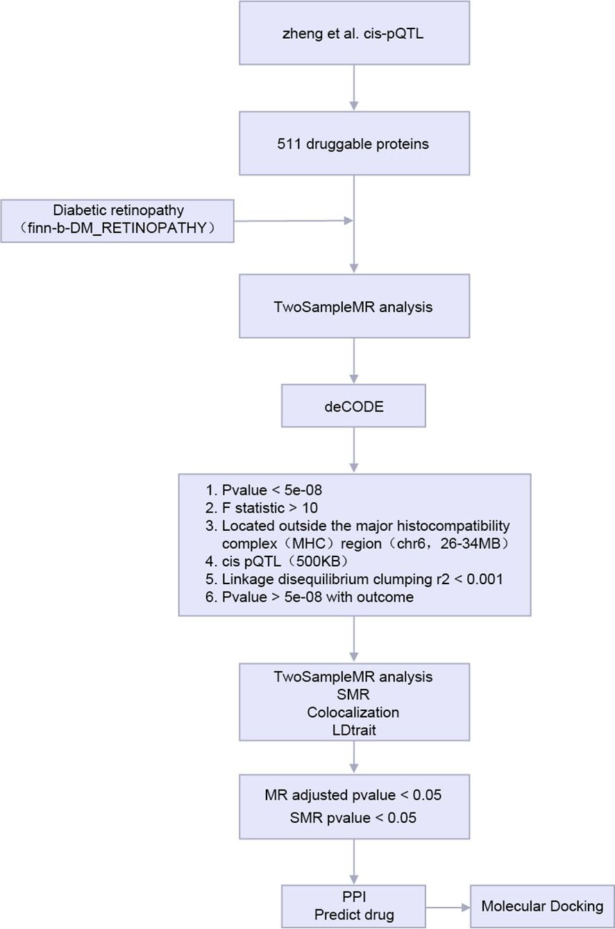 To investigate the correlation between genetic mutations and gene expression using protein expression as a trait, we employed protein quantitative trait loci (pQTL) analysis. For our preliminary analysis, we utilized cis-pQTL data reported by Zheng et al. (20), which included 738 cis-SNPs associated with 734 proteins (see Appendix Supplementary Table S2). This dataset helped us screen for pharmaceutically viable proteins for further investigation. Subsequently, we accessed filtered protein pQTL data from a large-scale integration of the plasma proteome with genetics and diseases (20), specifically using the deCODE 4674 protein database. These data served as the primary pQTL resource to identify potential drug targets for DR.The selection criteria for cis-pQTL variants were as follows: adjusted p-value < 5e-08; exclusion of SNPs within the major histocompatibility complex (MHC) region; and identification of SNPs located within 500KB upstream or downstream of the gene, while removing those with linkage disequilibrium r² < 0.001. The selected datasets were derived from individuals of European ancestry.This approach allowed us to systematically evaluate genetic associations with protein expression, thereby enhancing our ability to pinpoint promising drug targets for DR.