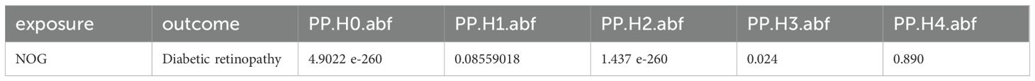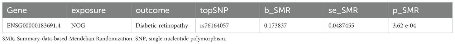 We aimed to gather further evidence through the analysis of the SMR pleiotropic presence. Table 6 shows that the SMR analysis results of NOG protein p_SMR < 0.05, indicating a causal relationship. Based on the results of colocalization analysis (Table 7), we observed a relationship between NOG and DR (PP.H4 > 0.8).