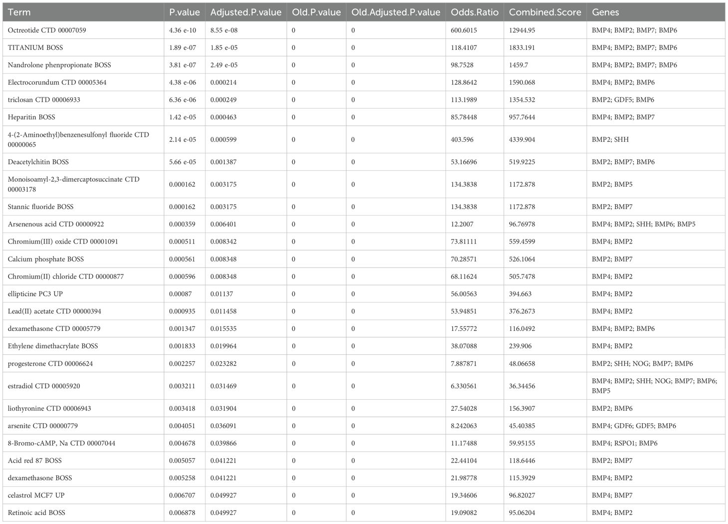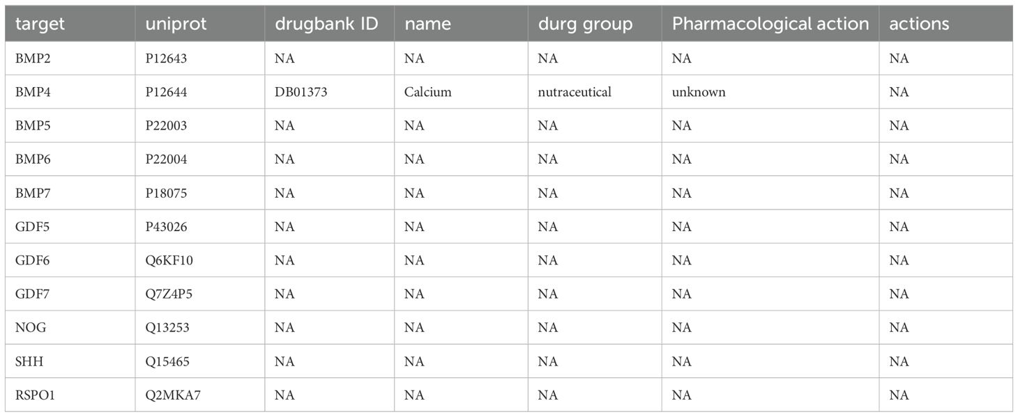 We extended the PPI analysis of druggable targets (such as NOG) using the STRING database and constructed a network of 10 related proteins (BMP2, BMP4, BMP5, BMP6, BMP7, GDF5, GDF6, GDF7, SHH, SHH, BMP2, BMP4, BMP5, BMP6, and BMP7) after retaining the targets that had connections with other nodes. RSPO1) in the protein-protein interaction network (Figure 3) We used 11 target proteins to analyze the potential drugs of target proteins by using the DURGBANK database. Table 8 shows that BMP4 encoded proteins corresponding to DB01373 drugs, NOG, BMP2, BMP5, BMP6, BMP7, GDF5, GDF6, GDF7, SHH, DB01373 drugs, NOG, BMP2, BMP5, BMP6, BMP7, GDF5, GDF6, GDF7, SHH, there is no corresponding drug for RSPO1 encoded protein, which could be further explored. We then used DSigDB on the Enrichr platform to screen results, with p.adjust <0.05 (Table 9), and we identified 00006624 estradiol and progesterone CTD CTD 00005920 NOG as potential drugs.