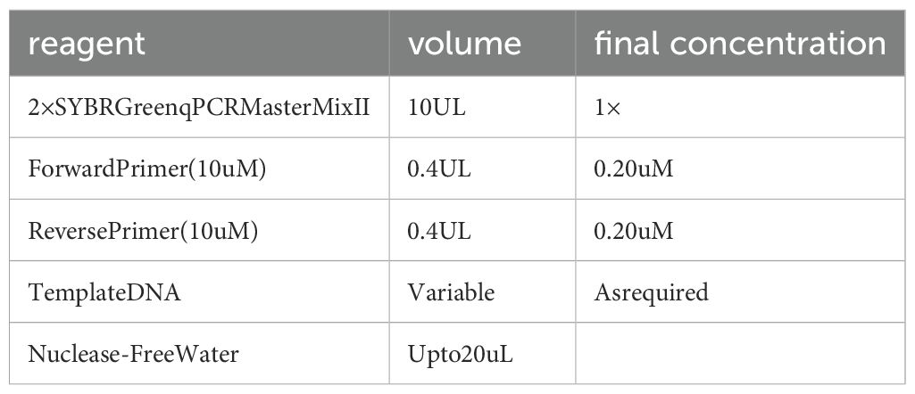 7. Real-time fluorescence quantitative PCR: Employ the kit (Cayin Innovation Biotechnology Co., Ltd.). Based on the manual, prepare the PCR reaction system on ice (see Table 10 below), mix uniformly, and then promptly transfer it to the PCR instrument. The amplification reaction conditions are carried out as per the instructions.HPRT1 was utilized as the internal reference gene. With β-actin serving as the internal reference gene, the required primer sequences are as follows: β-actin: upstream 5´-AAGGCCAACCGCGAGAA-3´, downstream 5´-ATGGGGGAGGGCATACC-3´; NOG: upstream 5´-CGCCCTGGAGTAATTTCGGA-3´, downstream 5´-GCGGAAGAAAGGCACACAAG-3´; Gdf5: upstream 5´-GCTGGGAGGTGTTCGACATC-3´, downstream 5´-CACGGTCTTATCGTCCTGGC-3´; Gdf6: upstream 5´-CACGAGTACATGCTGTCAATCT-3´, downstream 5´-CGTATTAGCCGACTTGGAAGAC-3´; Bmp2: upstream 5´-ACCCGCTGTCTTCTAGCGT-3´, downstream 5´-TTTCAGGCCGAACATGCTGAG-3´; Bmp4: upstream 5´-ATGATTCCTGGTAACCGAATGC-3´, downstream 5´-CCCCGTCTCAGGTATCAAACT-3´; Bmp6: upstream 5´-AGCGACACCACAAAGAGTTCA-3´, downstream 5´-GCTGATGCTCCTGTAAGACTTGA-3´. The relative expression level of NOG, BMP2,BMP4,BMP6, GDF5, and GDF 6 were calculated by the 2-ΔΔCt method. Three replicate wells were set for each sample, and the average of the three measurement results was taken.