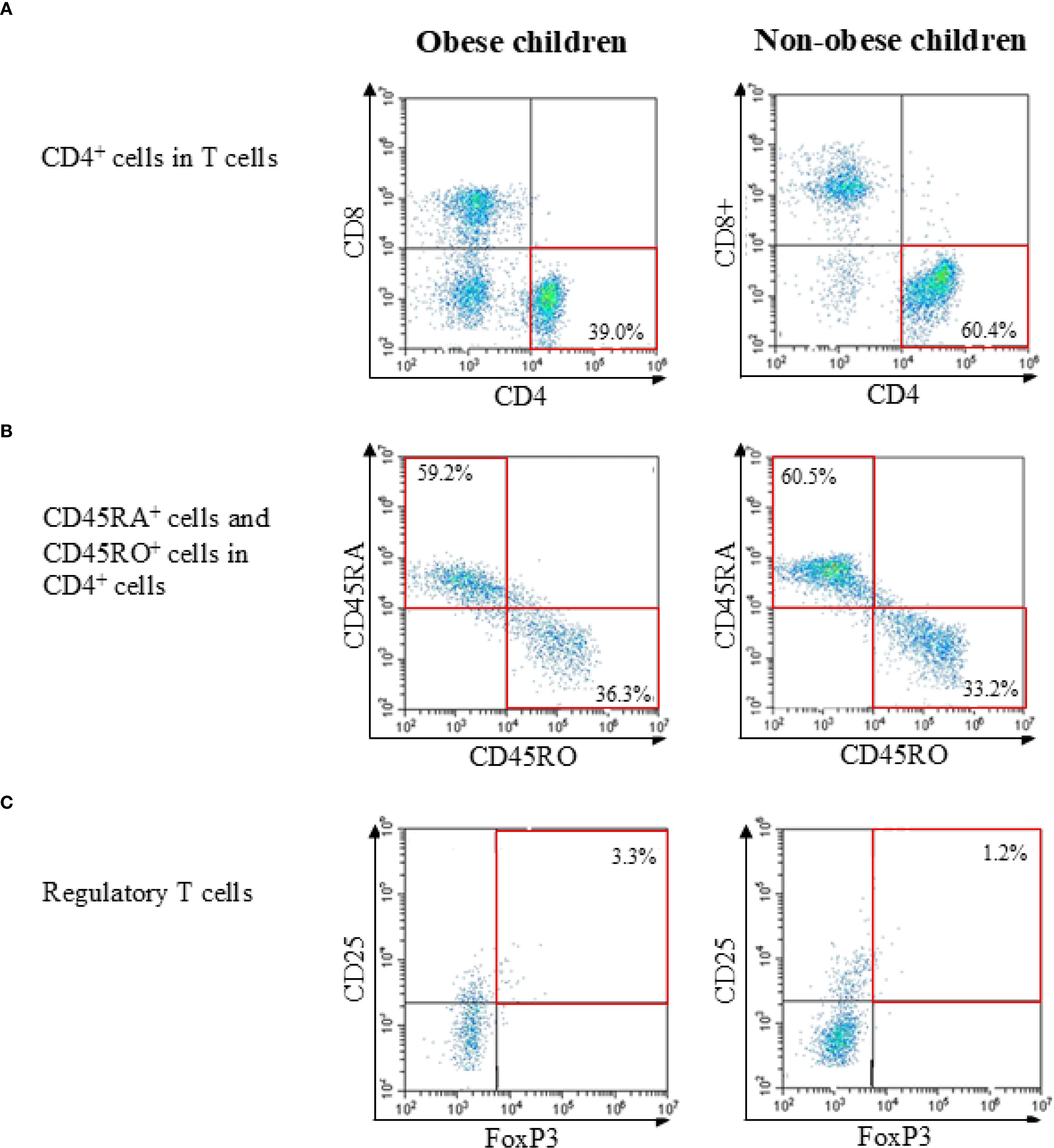 Figure 1. Representative flow cytometric gating strategies in obese child group and non-obese child group. (A) Identification of T cells within lymphocytes and separation into CD4+ and CD8+ subsets. (B) Analysis of naïve (CD45RA+) and memory (CD45RO+) subsets within CD4+ T cells. (C) Identification of regulatory T cells (CD4+CD25+FOXP3+) within CD4+ T cells. Percentages and representative values are shown in each plot.