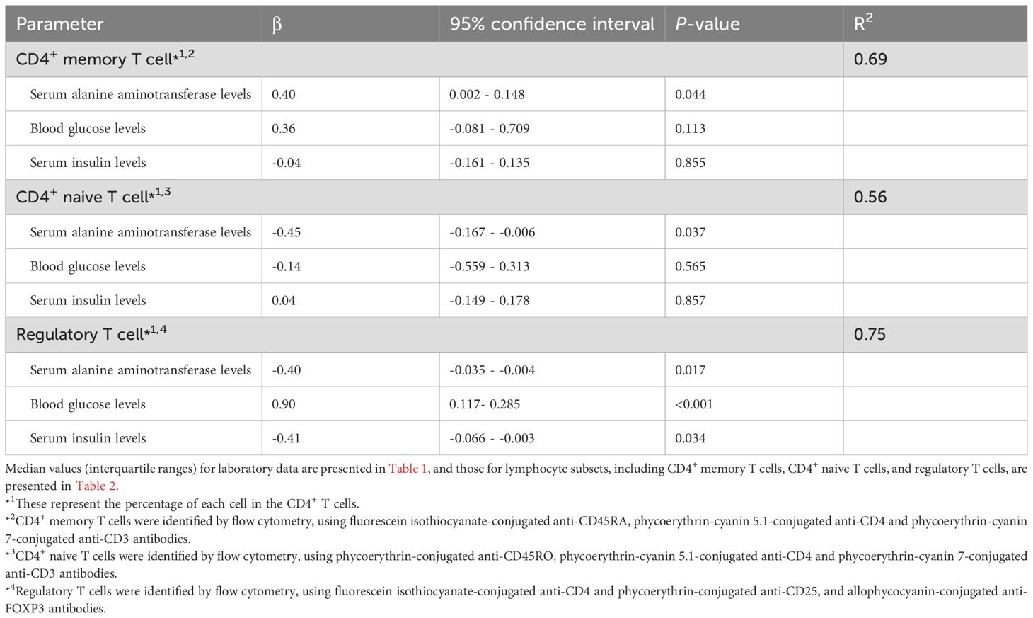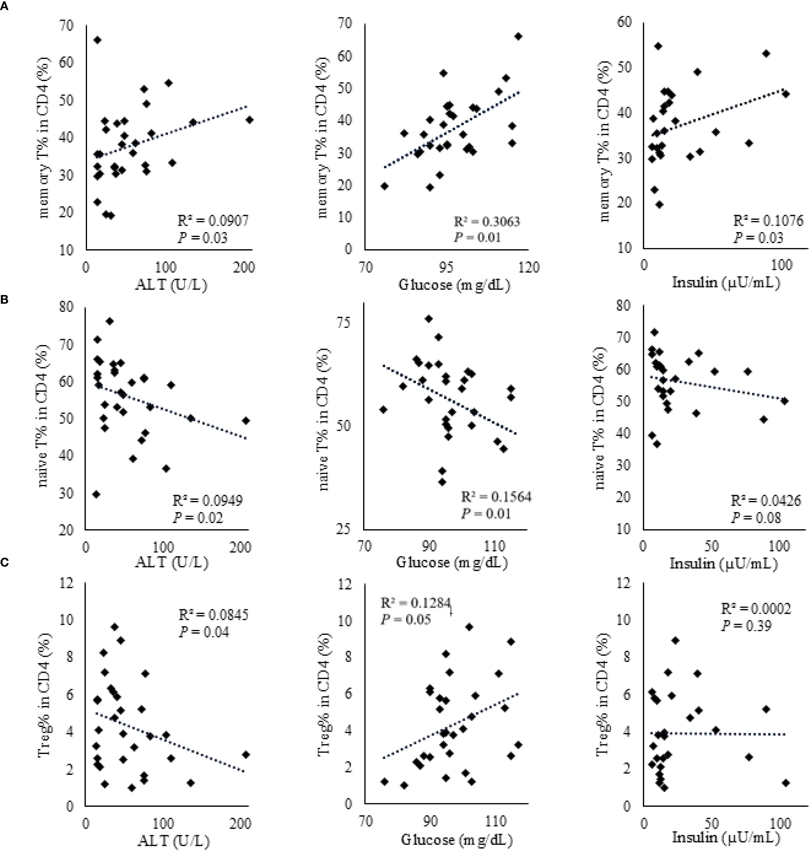 In the multivariate analysis, the proportion of memory CD4+ T cells showed a significant positive correlation with serum ALT levels (Table 4), while the proportion of naïve CD4+ T cells was significantly negatively correlated with serum ALT levels. Additionally, Treg counts showed a significant negative correlation with serum levels of ALT and insulin and a significant positive correlation with blood glucose levels.