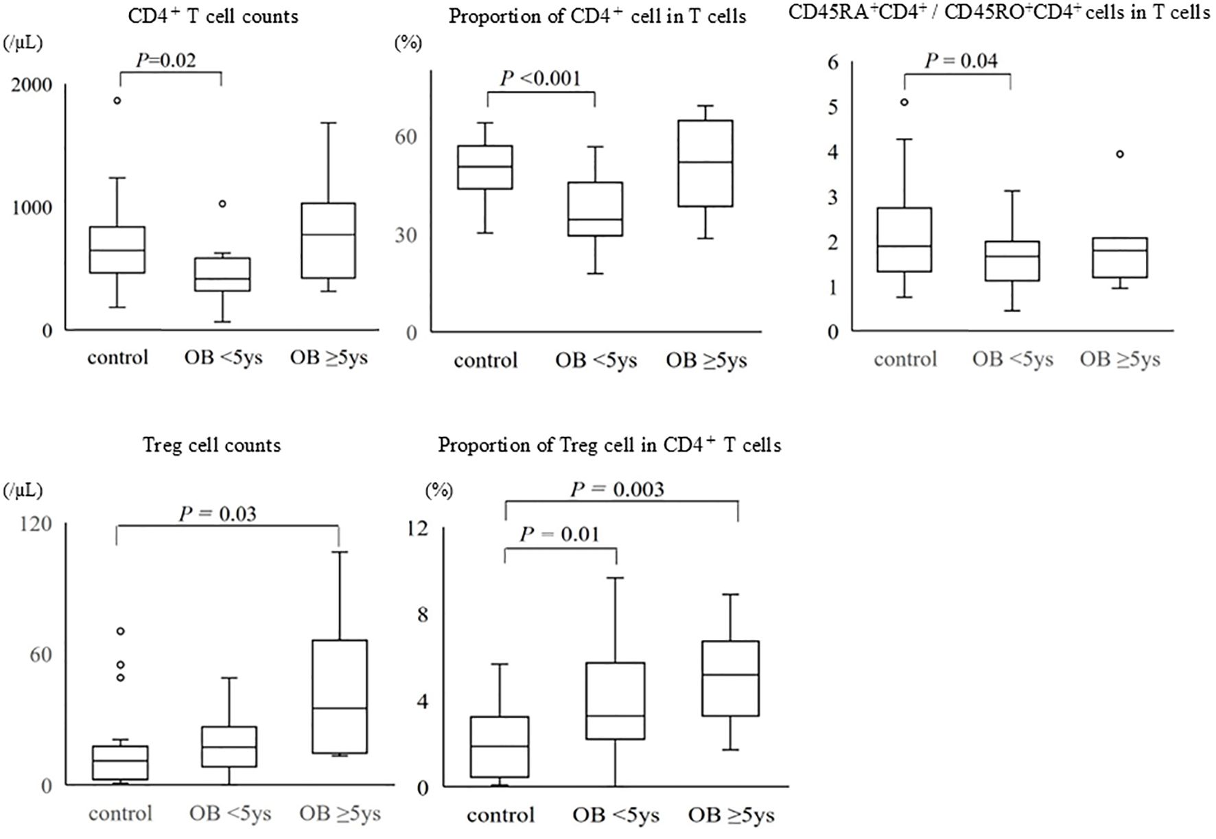 Figure 3. Comparison of CD4+ T cells and regulatory T cells among the groups of non-obese children, obese children with disease duration of <5 years, and those with disease duration of ≥5 years. The bottom and the top of the box correspond to the 25th and 75th percentile points, respectively. The line within the box represents the median, the whiskers indicate the values of the 10th and 90th percentiles, and the open circles represent the outlier values beyond the 10th and 90th percentiles. Control: non-obese children, OB <5 years: obese children with disease duration of <5 years, OB ≥5 years: obese children with disease duration of ≥5 years, Treg: regulatory T cell.