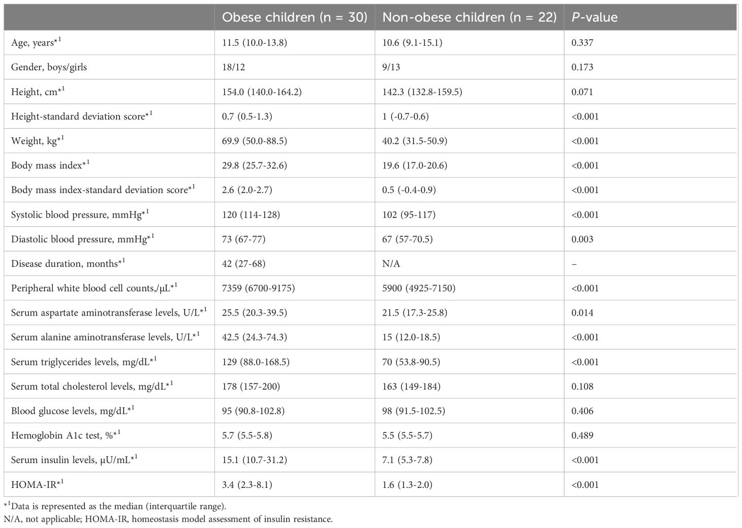 The demographic and clinical characteristics of the eligible children are summarized in Table 1. The median disease duration among obese children was 42 months (a quartile range of 27–68 months). Weight, BMI, BMI-SDS, and blood pressure were significantly higher in the obese children than in the non-obese children. Among laboratory markers, peripheral white blood cell (WBC) counts and serum levels of aspartate aminotransferase, alanine aminotransferase (ALT), triglycerides, total cholesterol, and insulin were significantly higher in obese children than in non-obese children. The median (interquartile range) HOMA-IR was 3.4 (2.3–8.1) in obese children and 1.6 (1.3–2.0) in non-obese children (<0.001), indicating increased insulin resistance in the obese group. HOMA-β was also calculated for reference, showing no evidence of impaired insulin secretion; however, as insulin resistance was the primary clinical parameter of interest, only HOMA-IR values are presented in Table 1.