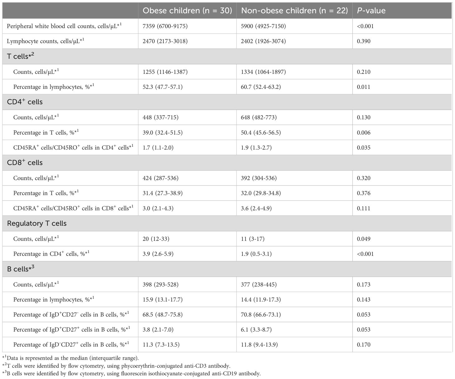 Methods: This prospective study included 30 obese children (median age: 11.5 years) and 22 age-matched non-obese controls. Lymphocyte populations were compared between the two groups. Additionally, factors influencing these populations were assessed in the obese group.