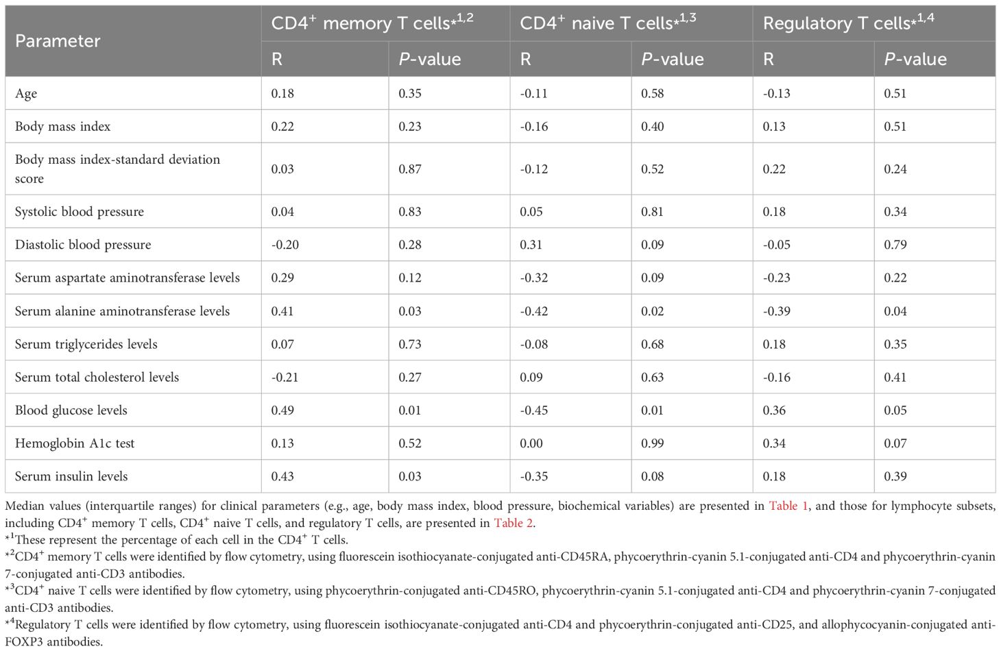 This study had some limitations. First, this was a single-center study with a small sample size. Although future multicenter studies with larger populations are necessary to improve the reliability and generalizability of the results, post-hoc power analyses for major outcome variables (e.g., CD4+ memory T cell proportion, regulatory T cell proportion, and serum insulin) indicated sufficient statistical power (≥0.95) to detect significant differences. This suggests that the present dataset is adequate to support the study conclusions despite the limited sample size. Second, the analysis of lymphocyte subsets was based on peripheral blood and did not directly involve immune cell infiltration or dynamics in adipose tissue. In adult obesity, immune cells in the adipose tissue play a crucial role in chronic inflammation; however, it is unknown if a similar mechanism exists in children. Finally, inflammatory cytokines were not measured in the present study. IL-6 and TNF-α promote chronic low-grade inflammation and impair insulin signaling, which can increase susceptibility to metabolic problems from childhood (28–30). Previous pediatric studies have already reported elevated levels of proinflammatory cytokines such as IL-6 and TNF-α, but the inclusion of cytokine measurements to this study could have allowed a more comprehensive evaluation of immune function. Future studies should consider combining immune cell phenotyping with cytokine profiling to better characterize immunometabolic interactions in pediatric obesity.