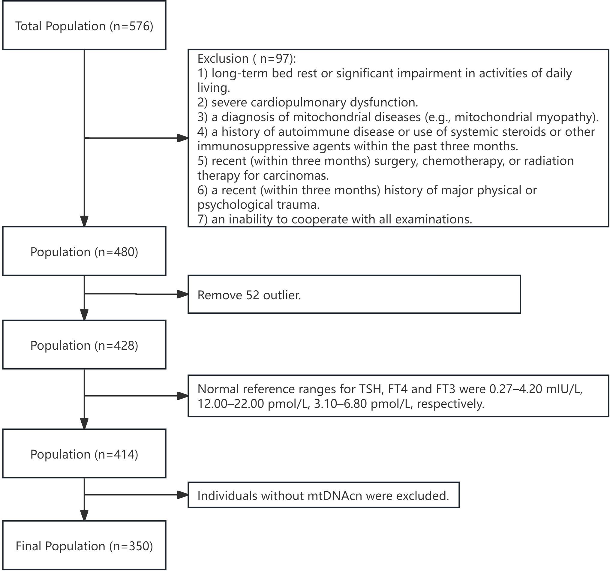 The study was conducted at Jiangsu Province Hospital from October 2020 to August 2022 (Figure 1). Inclusion criteria included: 1) the ability to undergo all necessary tests; 2) stable underlying conditions controlled by medication (e.g., diabetes, hypertension, coronary heart disease). Exclusion criteria were: 1) long-term bed rest or significant limitations in daily living; 2) severe cardiopulmonary dysfunction; 3) a history of mitochondrial diseases (e.g., mitochondrial myopathy); 4) autoimmune disorders or recent use of systemic steroids or immunosuppressants within the last three months; 5) recent surgery, radiation therapy, or chemotherapy for cancer within the past three months; 6) significant physical or psychological trauma in the last three months; 7) inability to cooperate with the necessary examinations; 8) thyroid dysfunction (i.e., overt or subclinical hypothyroidism or hyperthyroidism), a history of thyroid surgery, thyroid disease, or medications affecting thyroid function. Additionally, subjects with extreme outlying data, abnormal FT3, FT4 or TSH levels, or those lacking mtDNAcn data were excluded. The study was approved by the Ethical Committee of Jiangsu Province Hospital (2024-SR-087, 2019-NT-48), and written informed consent was obtained from all participants.