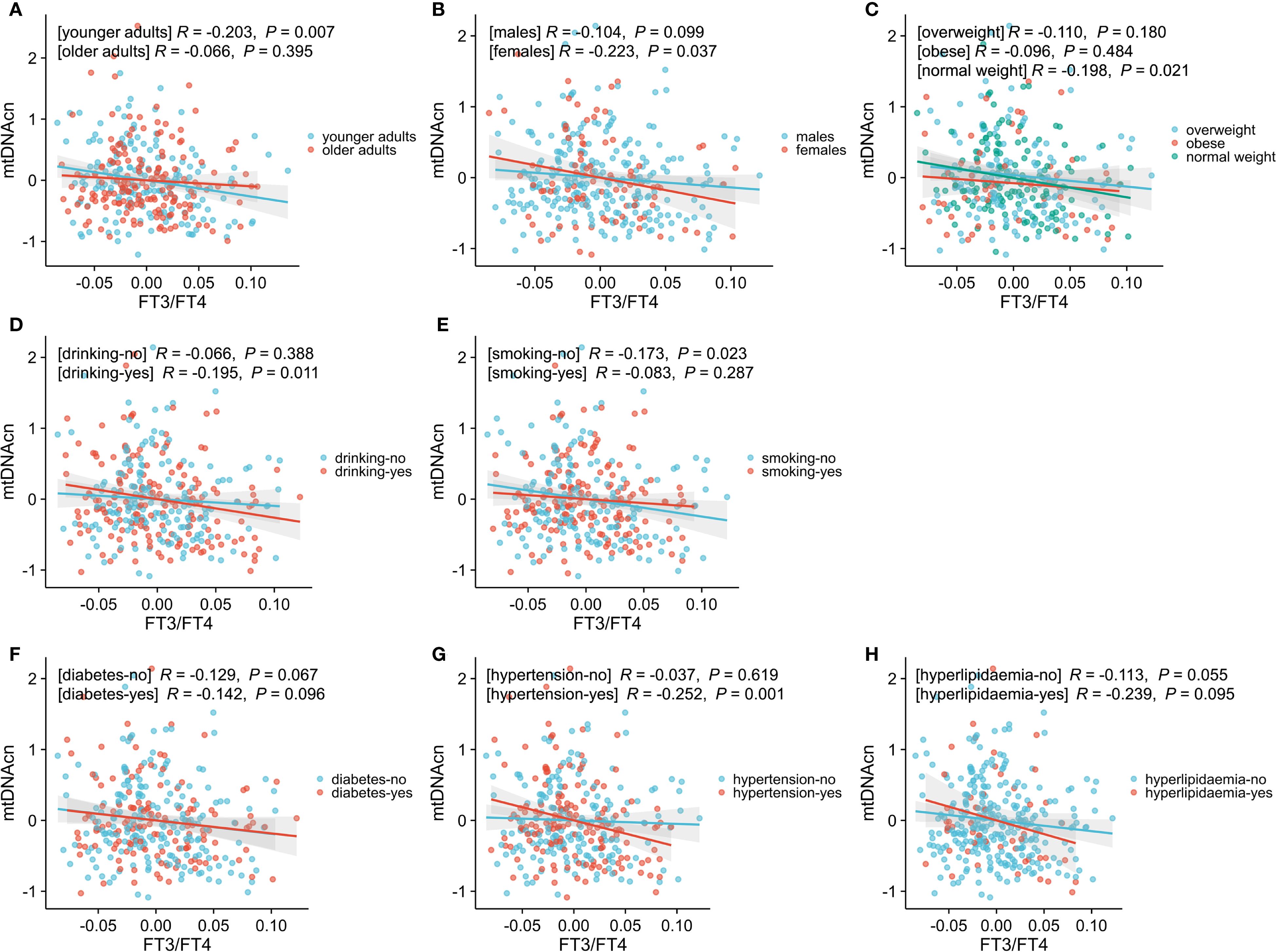 Figure 2. Associations between mtDNAcn and FT3/FT4, stratified by age (A), sex (B), BMI (C), drinking history (D), smoking history (E), diabetes history (F), hypertension history (G), and hyperlipidemia (H). Data were adjusted for these variables. Statistical significance was defined as a P-value< 0.05. Younger adults represent age < 60 years, while the older adults represent age ≥ 60 years; normal weight indicates 18.5 kg/m2≤ BMI< 24 kg/m2, overweight indicates 24 kg/m2 ≤ BMI< 28 kg/m2, and obesity indicates BMI ≥ 28 kg/m2. mtDNAcn, mitochondrial DNA copy number; FT3/FT4, free triiodothyronine to free thyroxine ratio; BMI, body mass index.