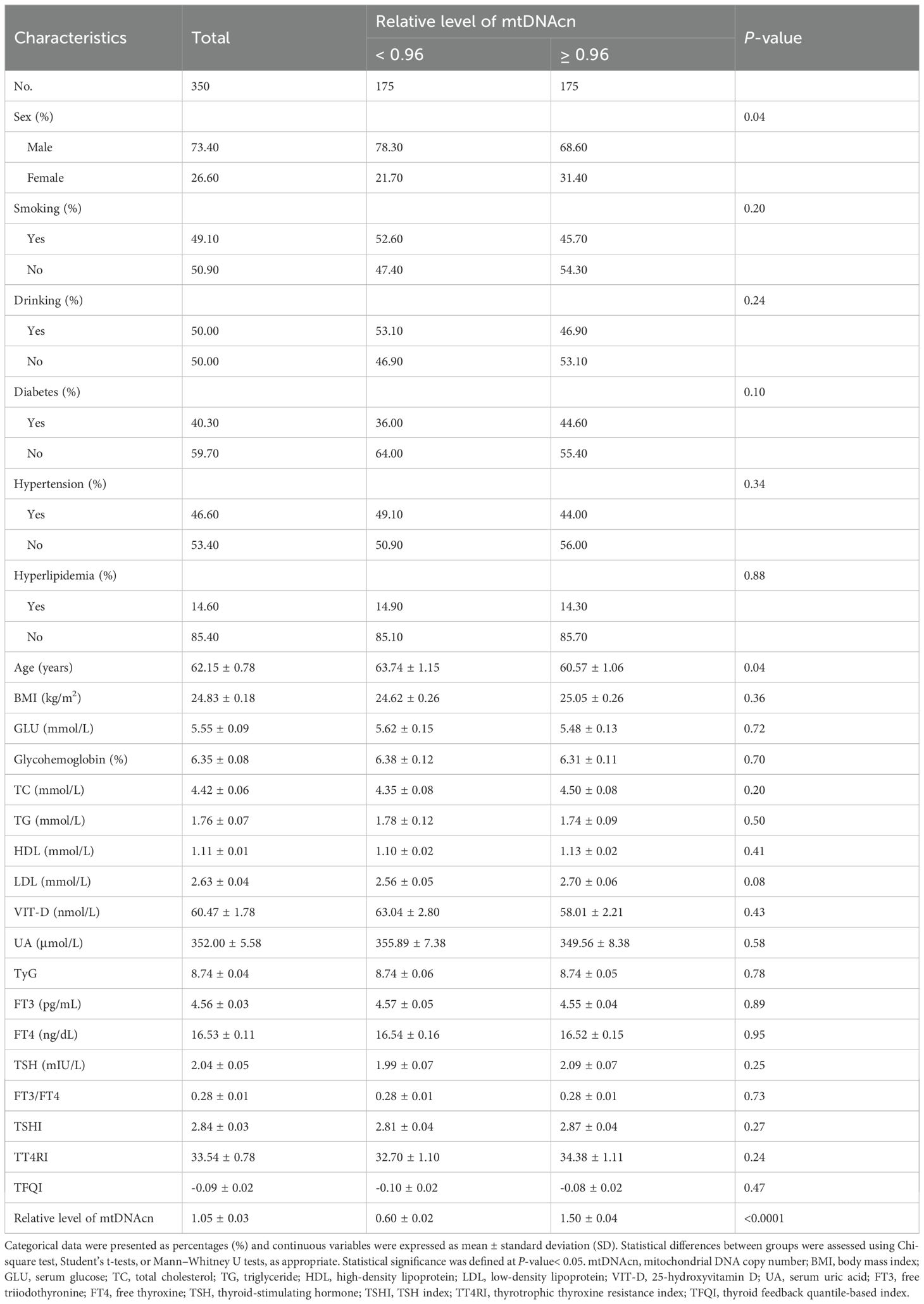 Table 1 summarized the baseline characteristics of the 350 euthyroid participants included in this study, comprising 257 males (73.4%) and 93 females (26.6%), with a mean age of 62.15 ± 0.78 years and an average BMI of 24.83 ± 0.18 kg/m2. The prevalence of comorbidities was as follows: diabetes (n=141, 40.3%), hypertension (n=163, 46.6%), and hyperlipidemia (n=51, 14.6%). Based on relative mtDNAcn, participants were divided into two groups: mtDNAcn< 0.96 (n=175) and mtDNAcn ≥ 0.96 (n=175). The group with higher mtDNAcn showed a greater proportion of males and younger individuals. No statistically significant differences were observed between the groups in terms of BMI, smoking and alcohol consumption, metabolic comorbidities (diabetes, hypertension, hyperlipidemia), or laboratory measures including glycohemoglobin, serum glucose, lipid profile (TC, TG, LDL, HDL), VIT-D, UA, TyG index, or thyroid-related indicators (FT3, FT4, TSH, FT3/FT4 ratio, TSHI, TT4RI, TFQI).