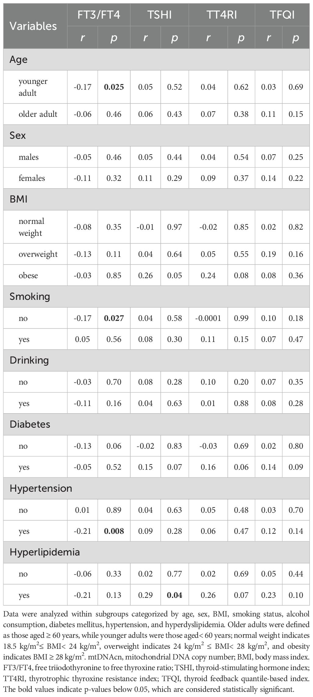 Correlation analyses were performed within subgroups stratified by age, sex, BMI, smoking status, alcohol use, and comorbidity (Table 2). A significant inverse correlation between the FT3/FT4 ratio and mtDNAcn was identified in younger individuals, while this association was absent in the older participants. No correlations between mtDNAcn and central sensitivity indices (TSHI, TT4RI, TFQI) in any age subgroup. Among non-smokers, a significant negative correlation was also observed between FT3/FT4 and mtDNAcn, which was not showed in smokers. Central sensitivity indices again showed no significant association with mtDNAcn regardless of smoking status. A similar pattern was observed in participants with hypertension, where an inverse association between FT3/FT4 and mtDNAcn was noted only in the hypertensive group. In the hyperlipidemia subgroup, mtDNAcn showed a significant positive correlation with TSHI, although FT3/FT4, TT4RI, and TFQI remained no association. In contrast, no statistically significant associations were observed in subgroups categorized by sex, BMI, alcohol consumption, or diabetes status.
