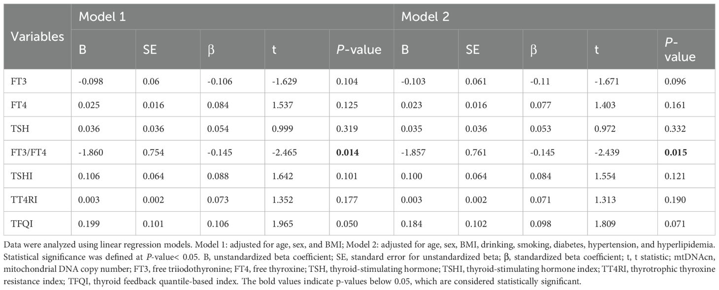 Results: Significant differences in age and sex were observed between groups with lower and higher mtDNAcn. Multivariate linear regression analysis showed a negative correlation between mtDNAcn and the FT3/FT4 ratio after adjusting for confounders such as age, sex, BMI, alcohol consumption, smoking history, hypertension, diabetes, and hyperlipidemia. This negative correlation remained significant in subgroups of younger adults, females, normal-weight individuals, drinkers, non-smokers, and those with hypertension. No significant relationships were found between mtDNAcn and TSHI, TT4RI, or TFQI after adjusting for confounding factors.