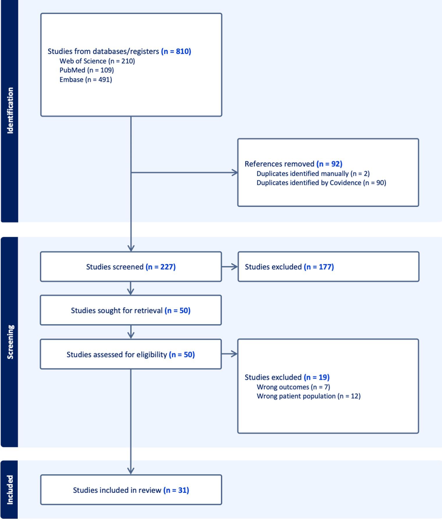 The initial search yielded 810 studies. After removing duplicates and non-relevant titles and abstracts, 50 full-text articles were reviewed. 13 articles were excluded if they did not (1) describe adrenal insufficiency attributable to ICI therapy, (2) provide sufficient clinical or biochemical information to confirm the diagnosis, or (3) include individual case-level data. Thirty-seven studies comprising single case reports and series were included. All included cases were manually extracted and assessed for clinical features, diagnostic approach, imaging findings, treatment, and outcomes. A PRISMA flow diagram outlining the study selection process is presented in Figure 1.
