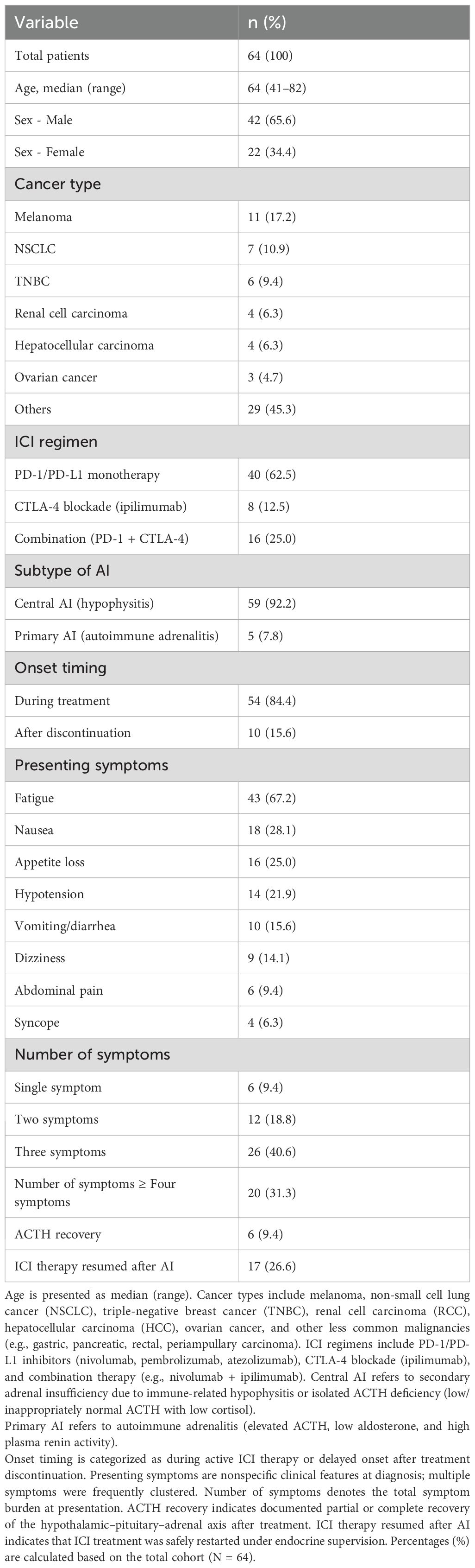 Importantly, the majority of cases (n = 59, 92.2%) represented central adrenal insufficiency (AI) secondary to immune-related hypophysitis or isolated ACTH deficiency, whereas only five cases (7.8%) fulfilled criteria for primary autoimmune adrenalitis with elevated ACTH, low aldosterone, and high plasma renin activity. This distinction highlights that central AI is the predominant phenotype in ICI-associated AI, particularly with CTLA-4 blockade, whereas primary adrenalitis remains rare.