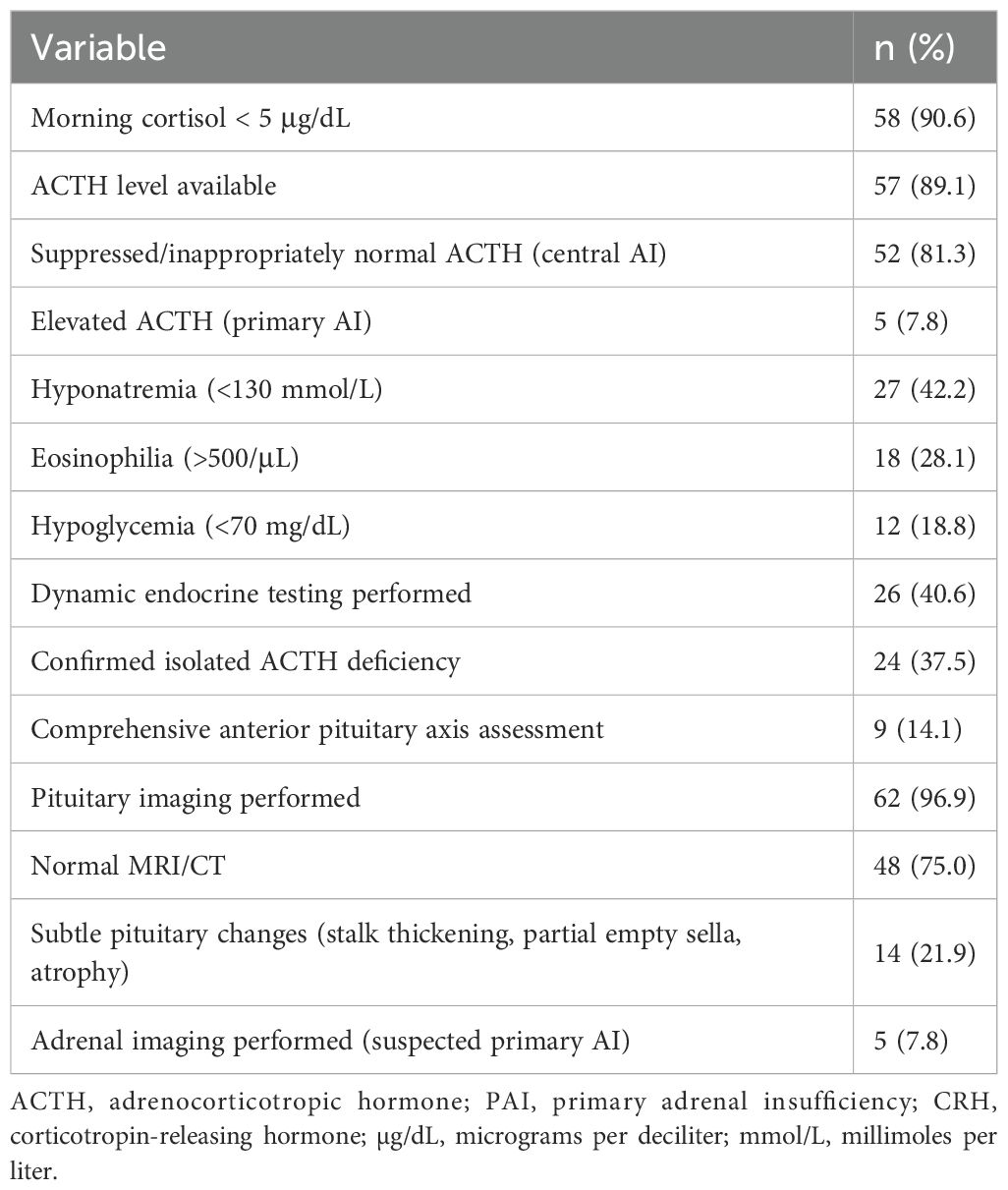The diagnosis of ICI-associated AI was primarily established based on low morning serum cortisol concentrations, typically <4 μg/dL, combined with inappropriately low or normal adrenocorticotropic hormone (ACTH) levels. Among the 64 analyzed cases, dynamic endocrine testing was performed in 26 cases (40.6%), and isolated ACTH deficiency was confirmed in 25 (96.2%).