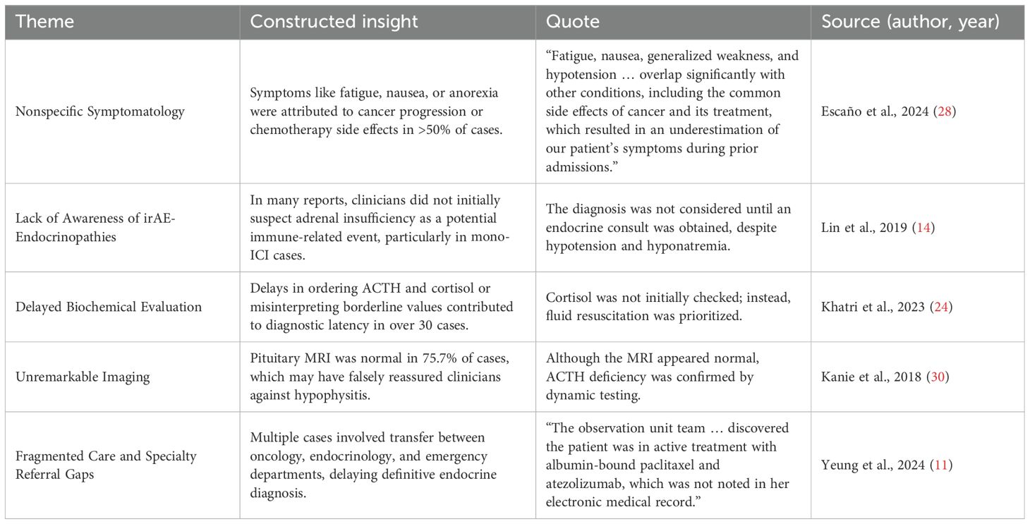 Thematic coding was performed using NVivo (QSR International), allowing for inductive identification of recurrent constructs relating to misdiagnosis, clinician decision-making, and system-level obstacles. A line-of-argument synthesis was used to construct a conceptual model describing how multilevel factors—including cognitive bias, diagnostic uncertainty, fragmented care, and inconsistent testing—interact to contribute to the delayed diagnosis of ICI-related adrenal insufficiency (10).