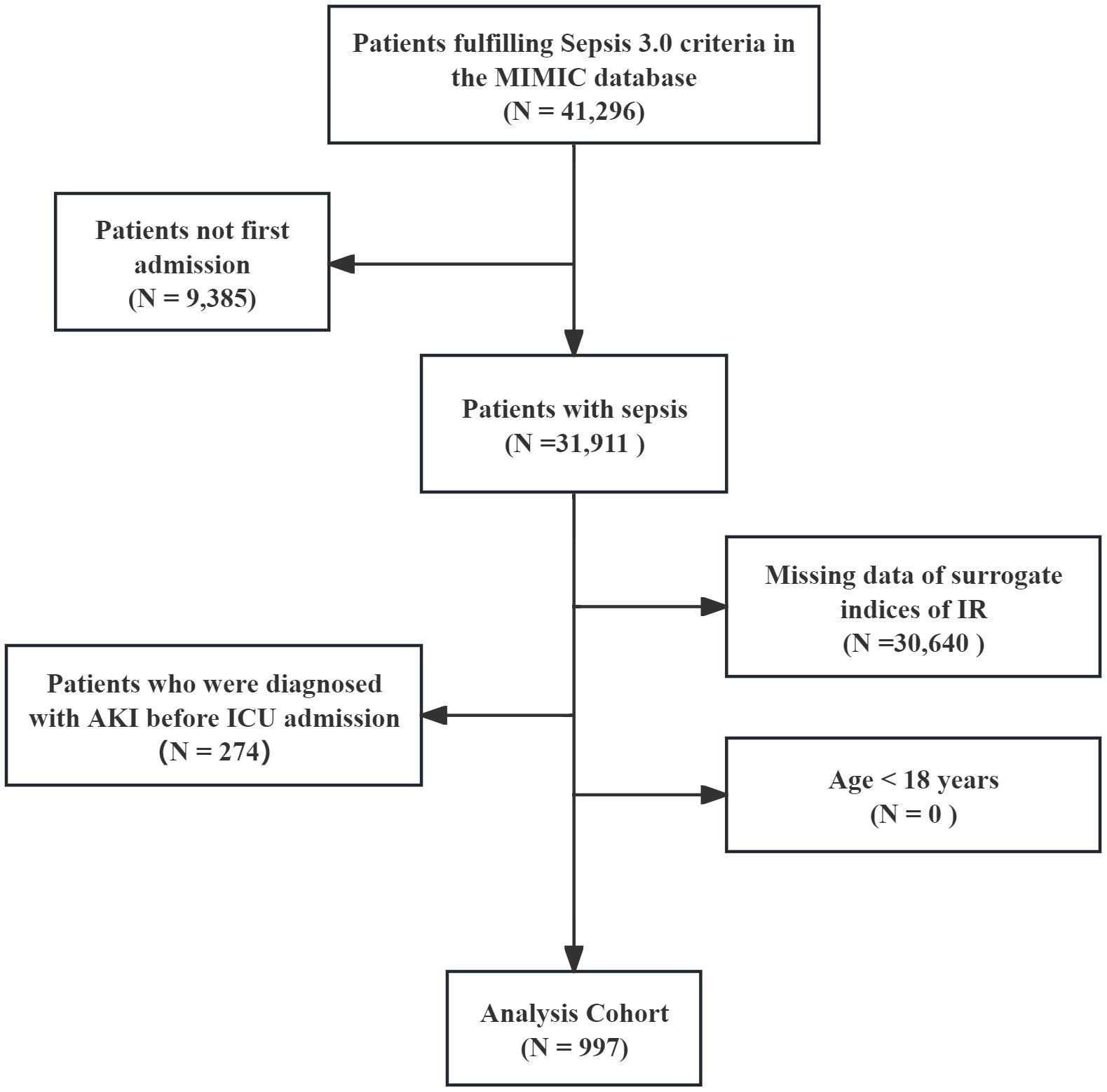 Flowchart illustrating patient selection for analysis. Out of 41,296 patients meeting Sepsis 3.0 criteria in the MIMIC database, 31,911 had sepsis. Exclusions include 9,385 not first admissions, 30,640 with missing surrogate index data, and 274 diagnosed with acute kidney injury before ICU admission. Zero patients were under eighteen years. Final analysis cohort comprised 997 patients.