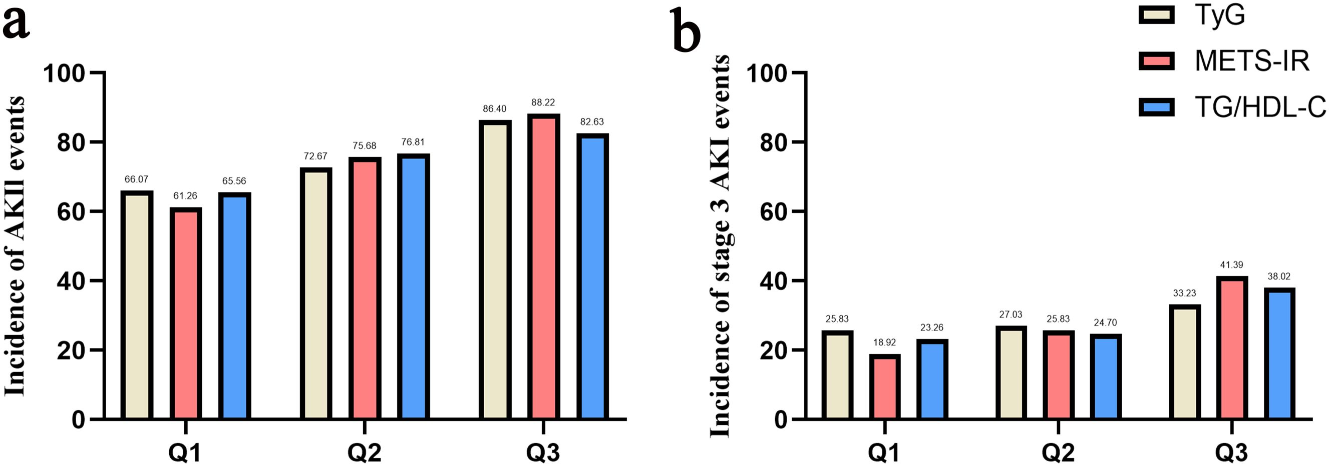 Figure 2. Bar graph of incidence of AKI (a) and stage III AKI (b) based on TyG index, METS-IR and TG/HDL-C.