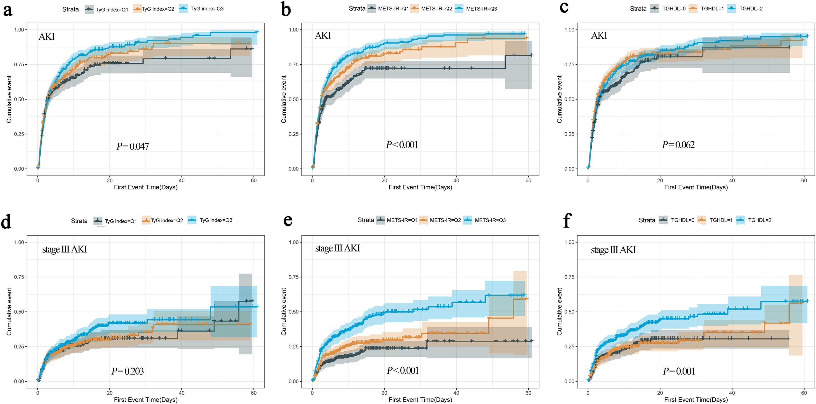 Figure 3. The cumulative event incidence curves for AKI based on TyG index (a), METS-IR (b) and TG/HDL-C (c). The cumulative event incidence curves for stage III AKI based on TyG index (d), METS-IR (e) and TG/HDL-C (f).