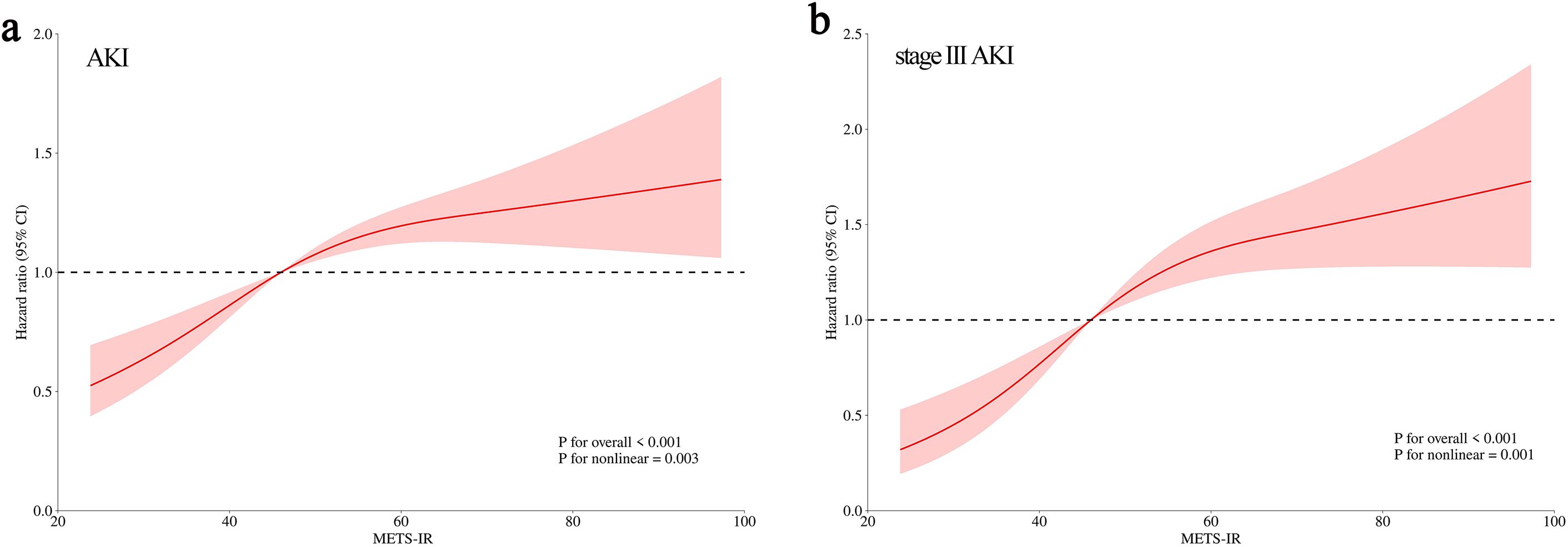 Figure 4. Restricted cubic spline analysis of METS-IR with AKI (a) and stage III AKI (b).