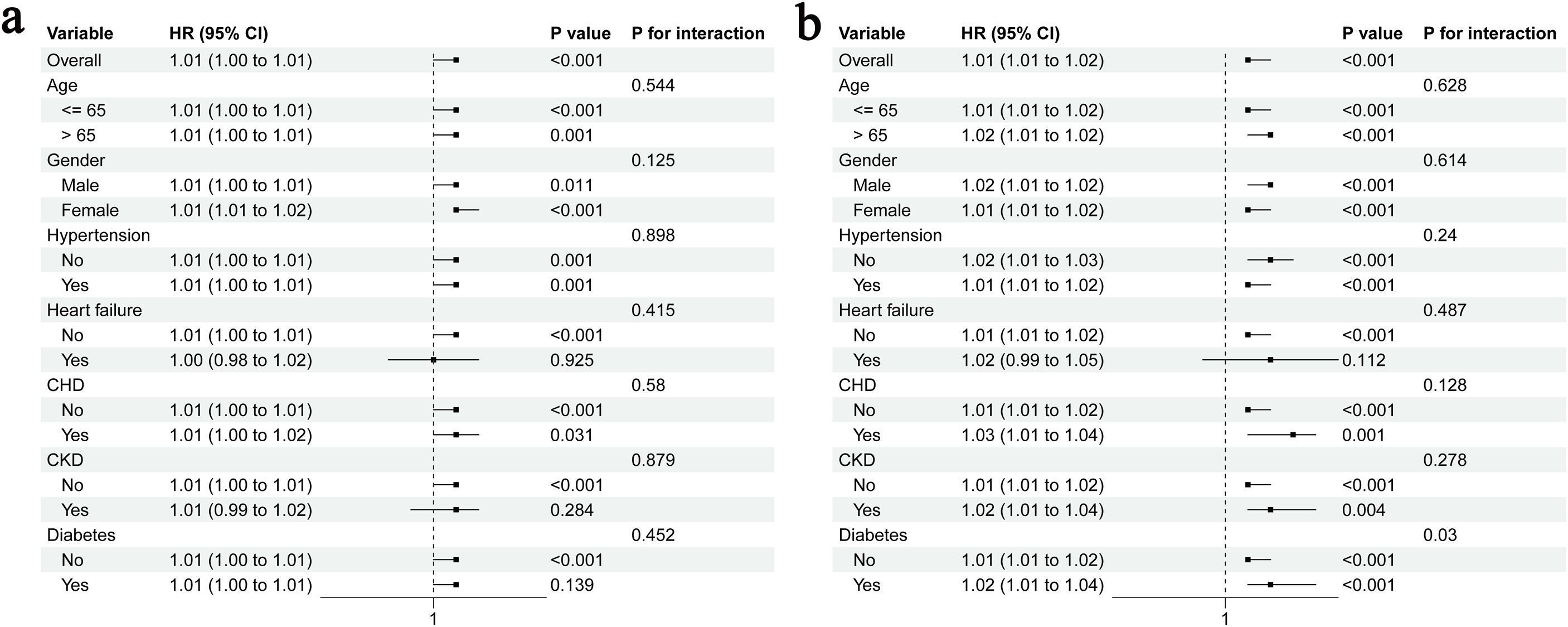 Comparison of two forest plots labeled a and b. Each plot shows hazard ratios (HR) with confidence intervals (CI) for variables like age, gender, and medical conditions. Plot a has HR around 1.01 for most variables with varying P values. Plot b shows slightly higher HR values, with some reaching 1.03, also with varying P values. Each plot includes a vertical line at HR=1, indicating the null effect.