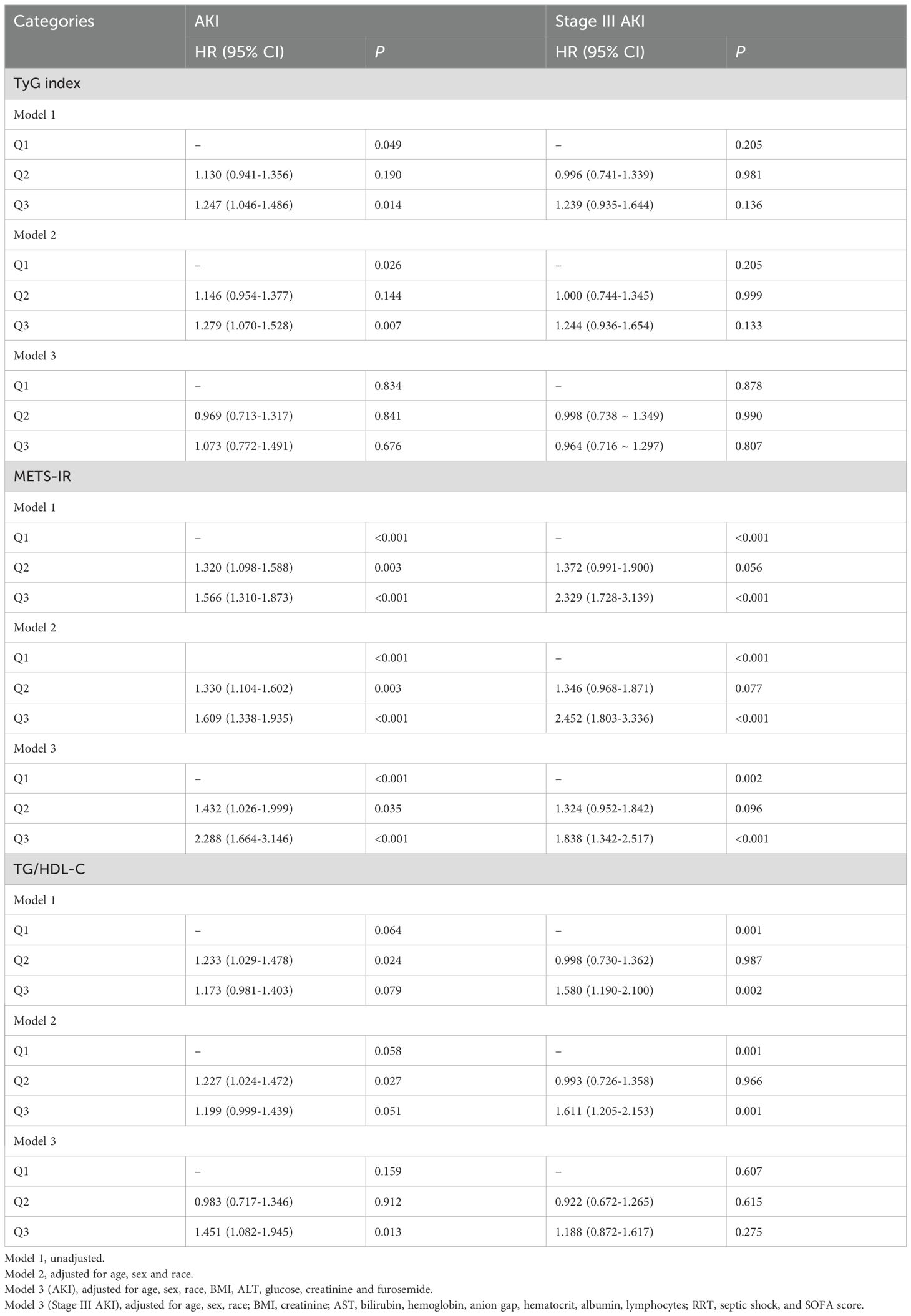 Next, three Cox regression models were conducted to adjust for potential confounders: Model 1: unadjusted; Model 2: adjusted for age, sex and race; Model 3 (AKI): adjusted for age, sex, race, BMI, ALT, glucose, creatinine and furosemide; Model 3 (Stage III AKI): adjusted for age, sex, race, BMI, creatinine, AST, bilirubin, hemoglobin, anion gap, hematocrit, albumin, lymphocytes, RRT, septic shock and SOFA score. When METS-IR was used as a categorical variable in Models 3, the risk of AKI in the Q2 and Q3 groups was 31.3% and 52.4% higher than that in the Q1 group (P = 0.005 and P < 0.001, respectively), and the risk of stage III AKI was 40.2% and 85.5% higher (P = 0.043 and P < 0.001, respectively) (Table 1). Using TyG index as a categorical variable in Models 3, there was no overall significant difference between the groups for either AKI (P = 0.066) or stage III AKI (P = 0.855), although Q3 group showed a higher risk of AKI compared to Q1 group (P = 0.020) (Table 1). Meanwhile, there was also no significant difference between the groups for either AKI or stage III AKI for TG/HDL-C. Meanwhile, the results of the competitive risk analysis using the Fine-Gray model were similar to those of the cox regression analysis (Supplementary Table S3).