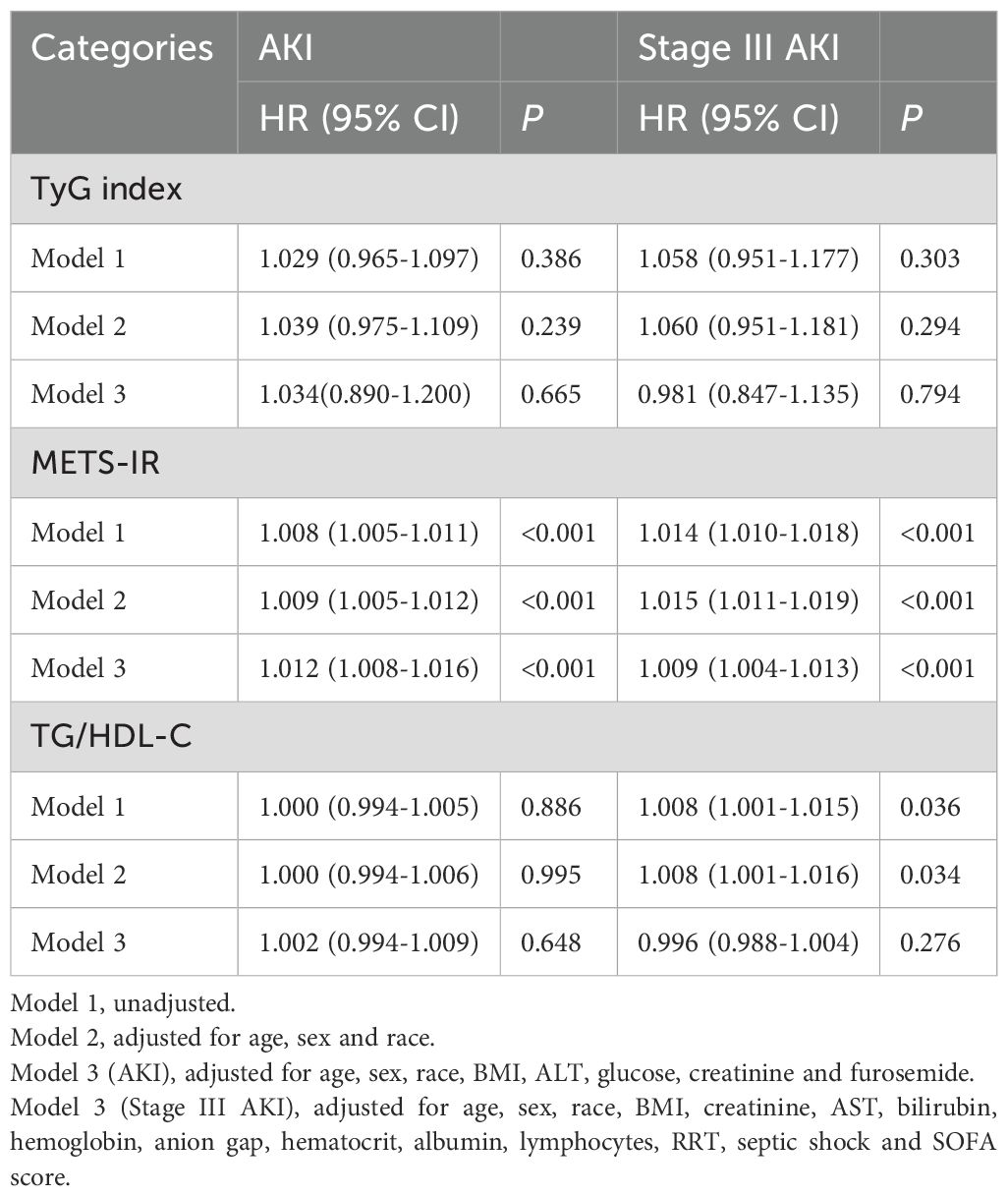 When METS-IR was used as a continuous variable, the risk of AKI and stage III AKI increased with METS-IR increasing, whether in model 1, 2, or 3 (all P < 0.001). However, similar results were not shown for TyG and TG/HDL-C (all P > 0.05) (Table 2).
