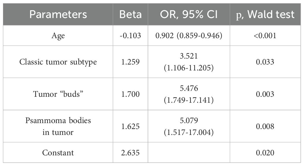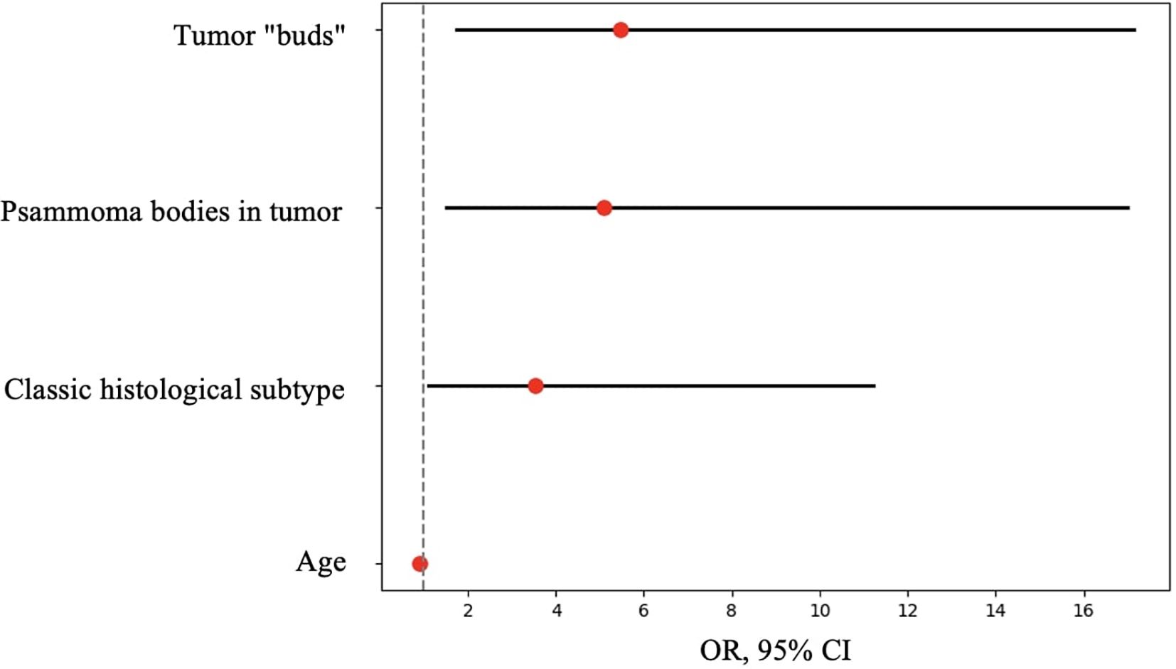 Thus, the presence of a classic tumor subtype, tumor “buds,” and psammoma bodies in tumor tissue increased the chance of metastases by 3.5, 5.5, and 5 times, respectively. Each additional year of age reduced the chance of metastases by 10% of the current value.