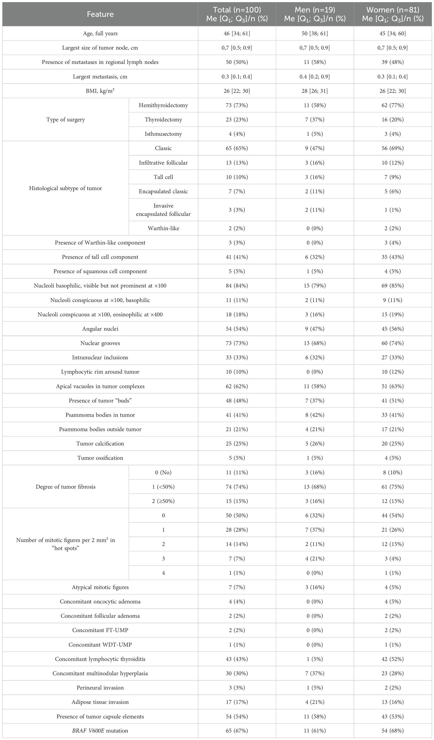 Methods: A total of 100 cases were retrospectively analyzed, including 50 with confirmed lymph node metastases and 50 without. A detailed histological assessment included evaluation of tumor subtype, nuclear features, presence of psammoma bodies, tumor “buds,” fibrosis, and other parameters. Clinical variables such as age, sex, body mass index, and presence of the BRAF V600E mutation were also considered.